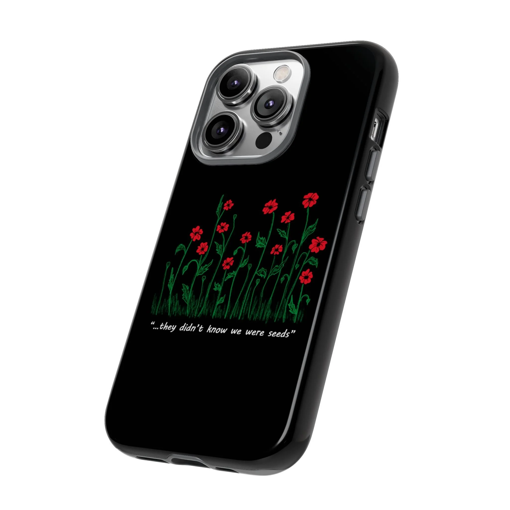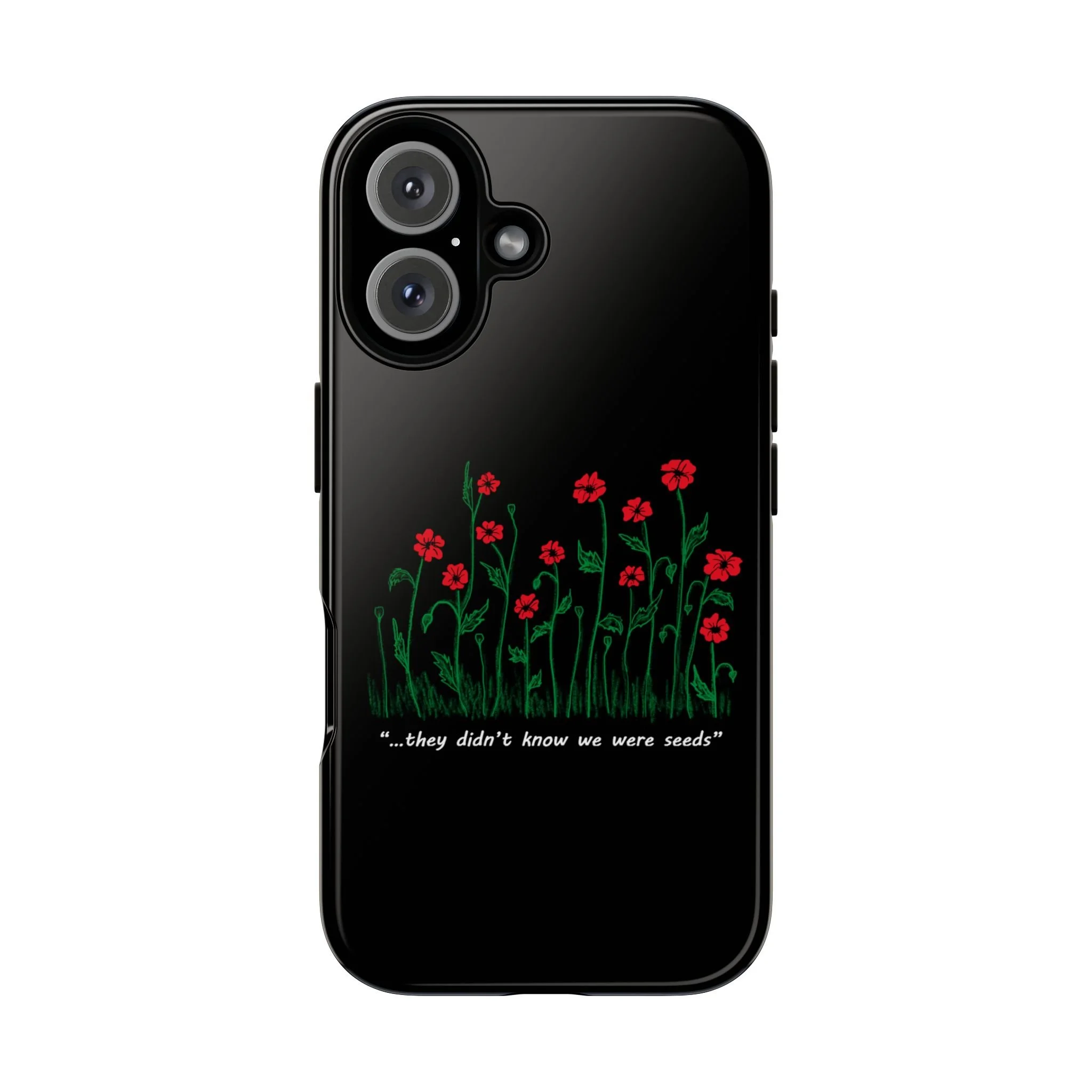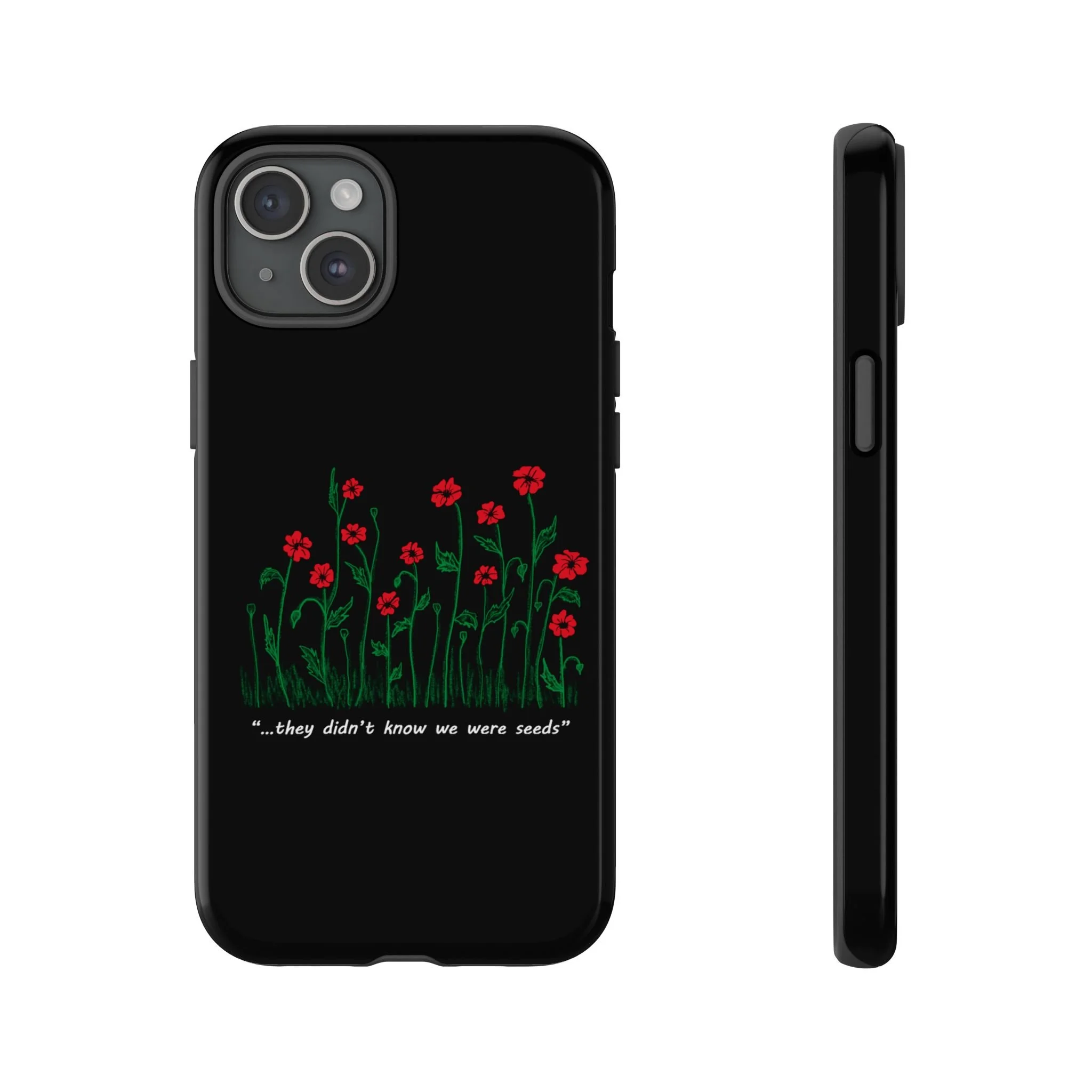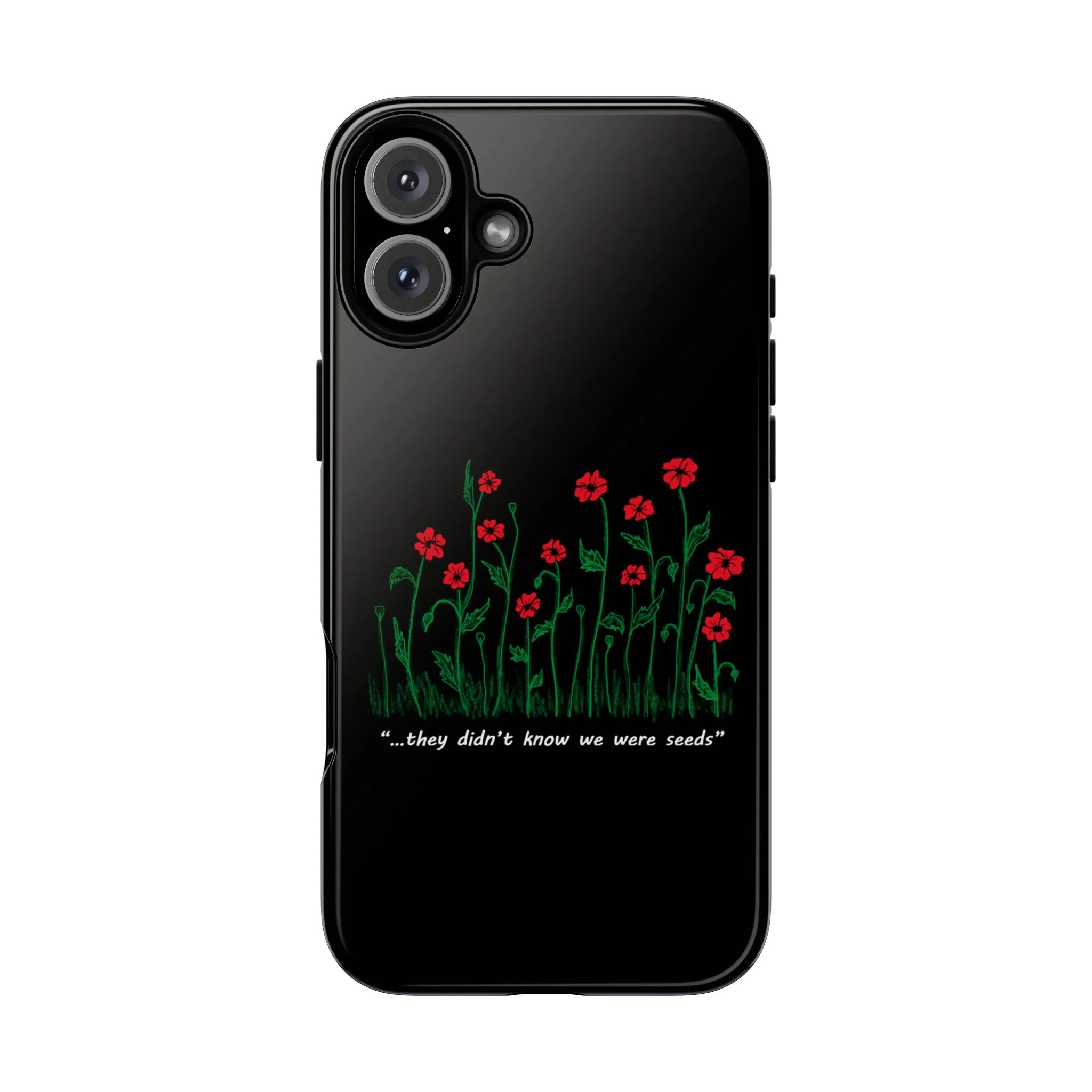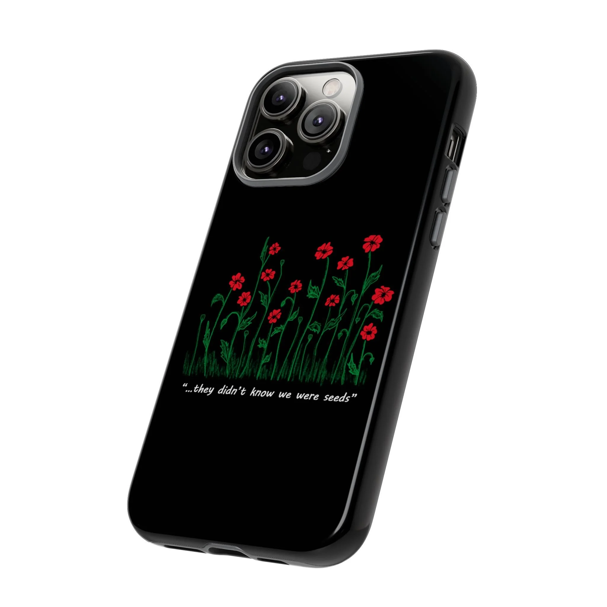 A slim, dual-layer phone case that carries a quiet, defiant charm — delicate red blossoms rising against a deep black backdrop with the small, resonant line: “...they didn’t know we were seeds.” The glossy or matte finish lets the rich 3D-wrapped print stand out while the TPU silicone inner liner cushions daily bumps and drops. This case keeps your device looking artful and guarded: clear cutouts for ports, wireless charging compatibility, and outdoor-resistant UV protection maintain the image and function through everyday use. Thoughtful compliance and durable materials make it a reliable everyday companion for someone who finds strength in subtlety. Speak truth to power with this powerful message. Please reach out if you don't see your phone type and it will get added.