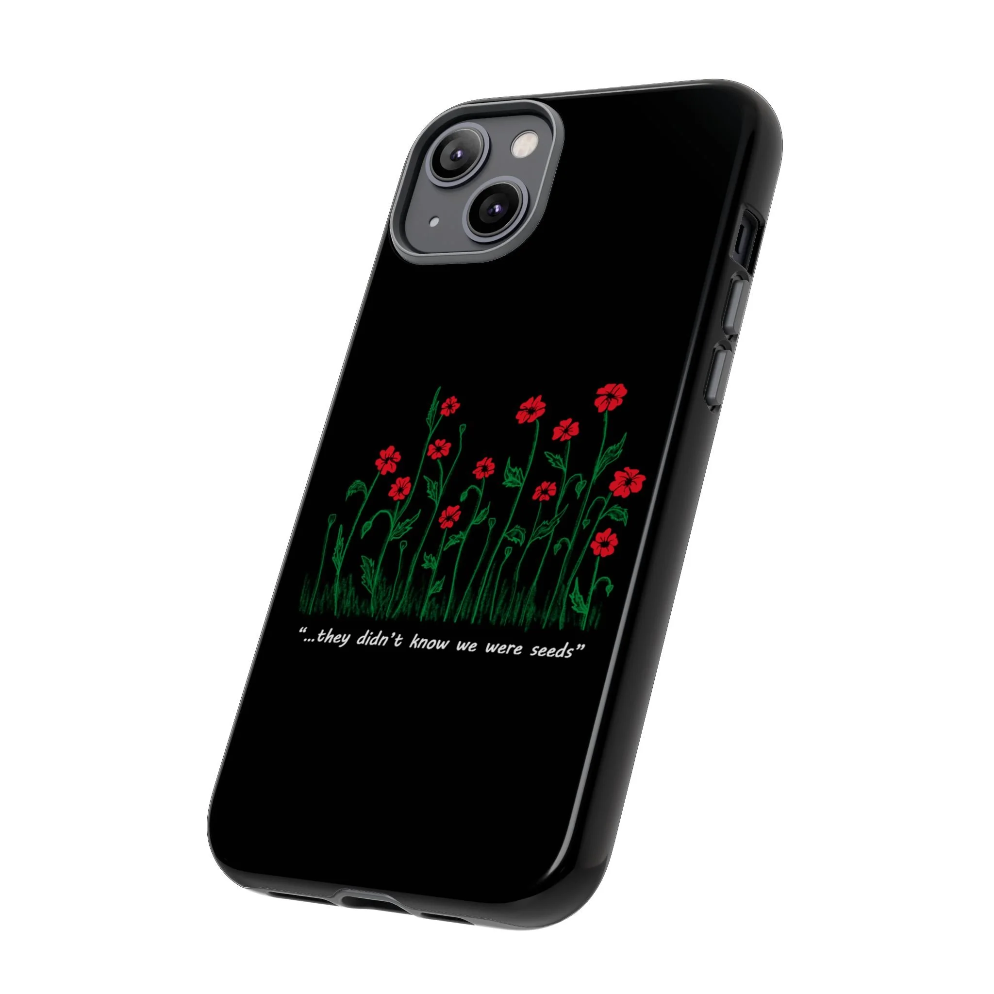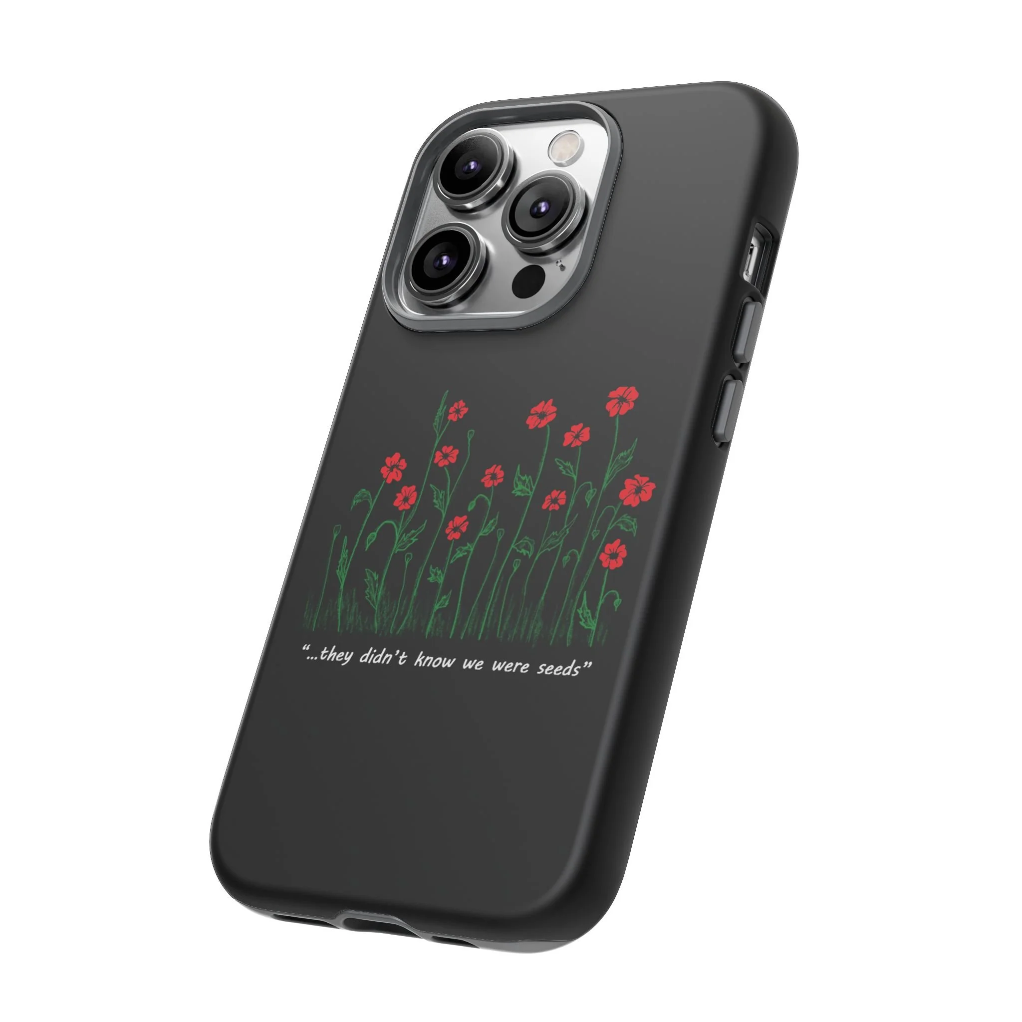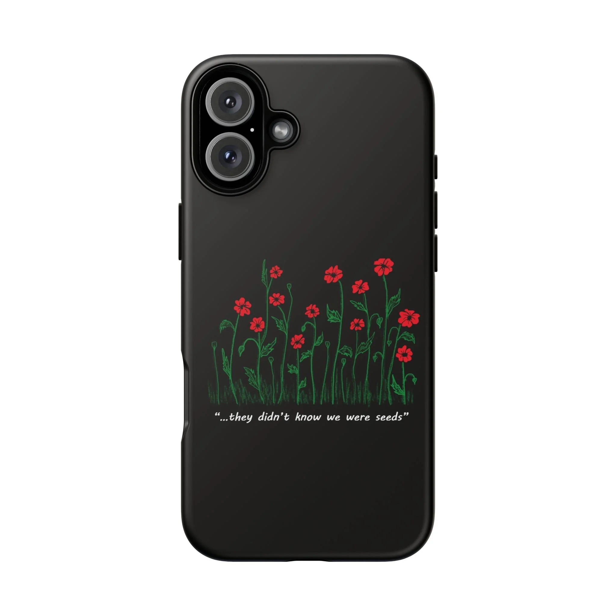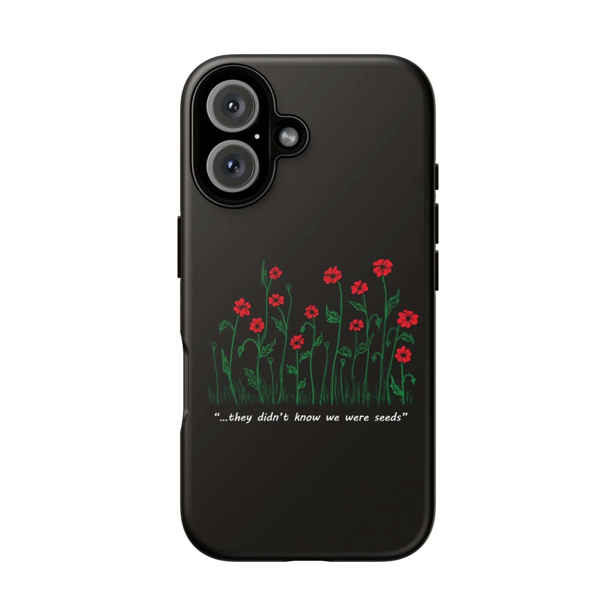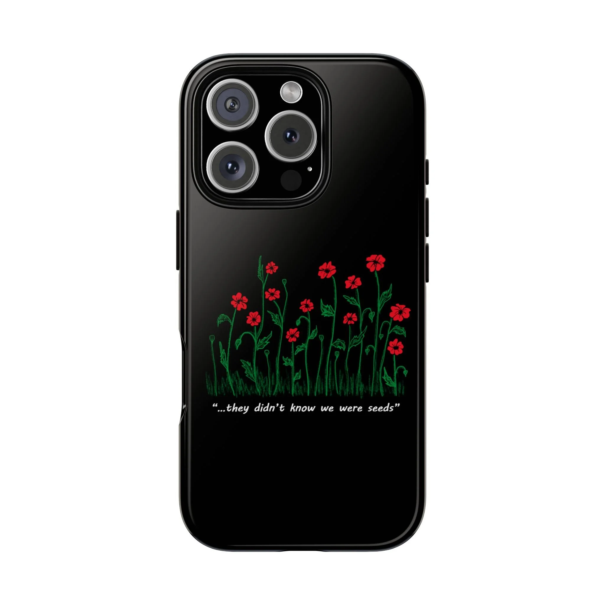 A slim, dual-layer phone case that carries a quiet, defiant charm — delicate red blossoms rising against a deep black backdrop with the small, resonant line: “...they didn’t know we were seeds.” The glossy or matte finish lets the rich 3D-wrapped print stand out while the TPU silicone inner liner cushions daily bumps and drops. This case keeps your device looking artful and guarded: clear cutouts for ports, wireless charging compatibility, and outdoor-resistant UV protection maintain the image and function through everyday use. Thoughtful compliance and durable materials make it a reliable everyday companion for someone who finds strength in subtlety. Speak truth to power with this powerful message. Please reach out if you don't see your phone type and it will get added.