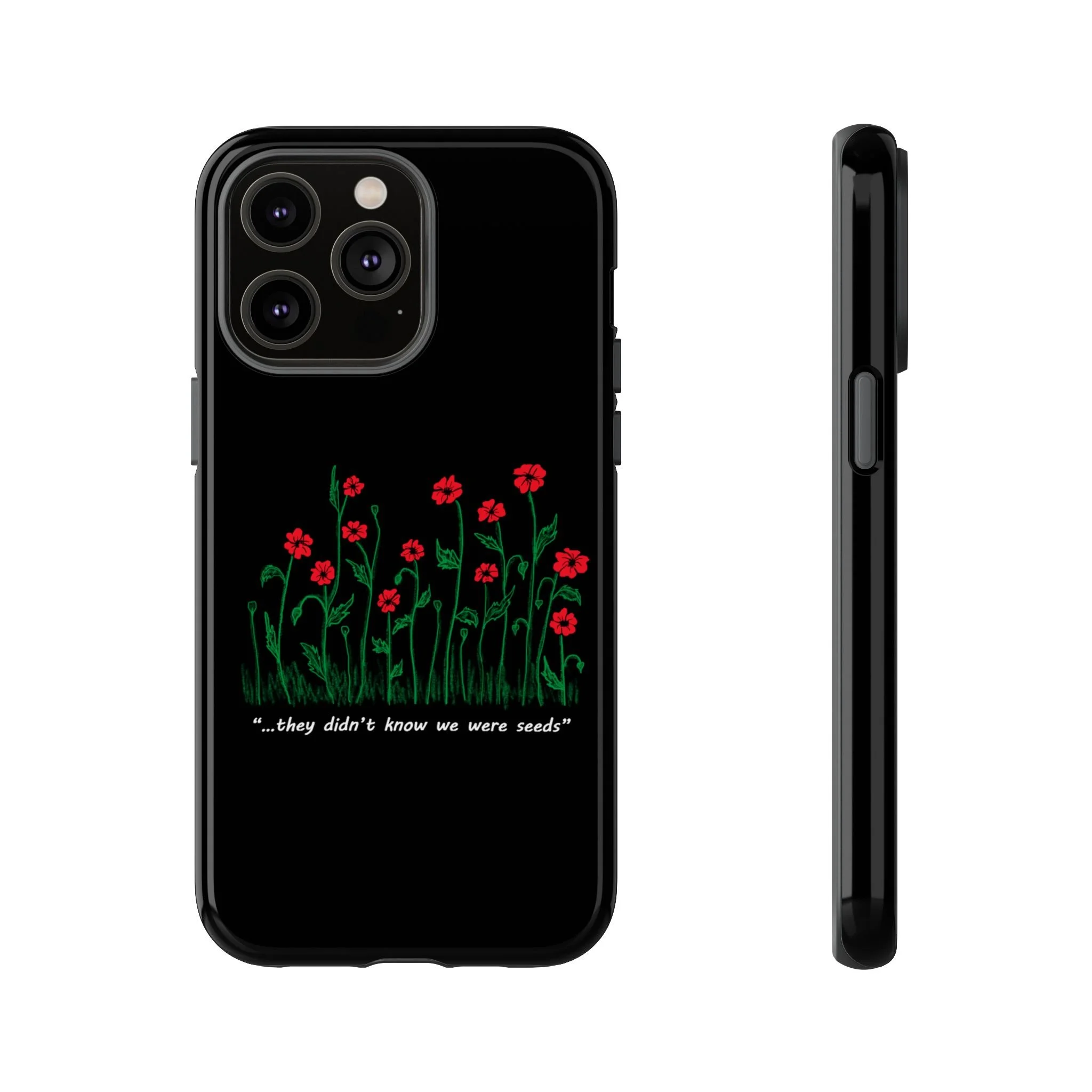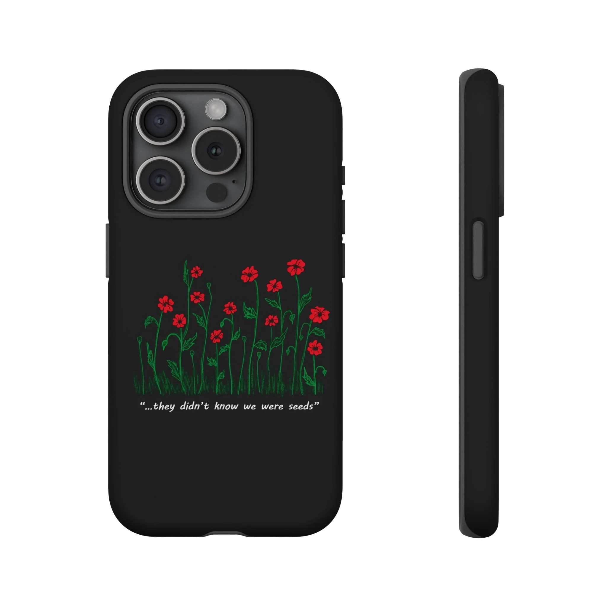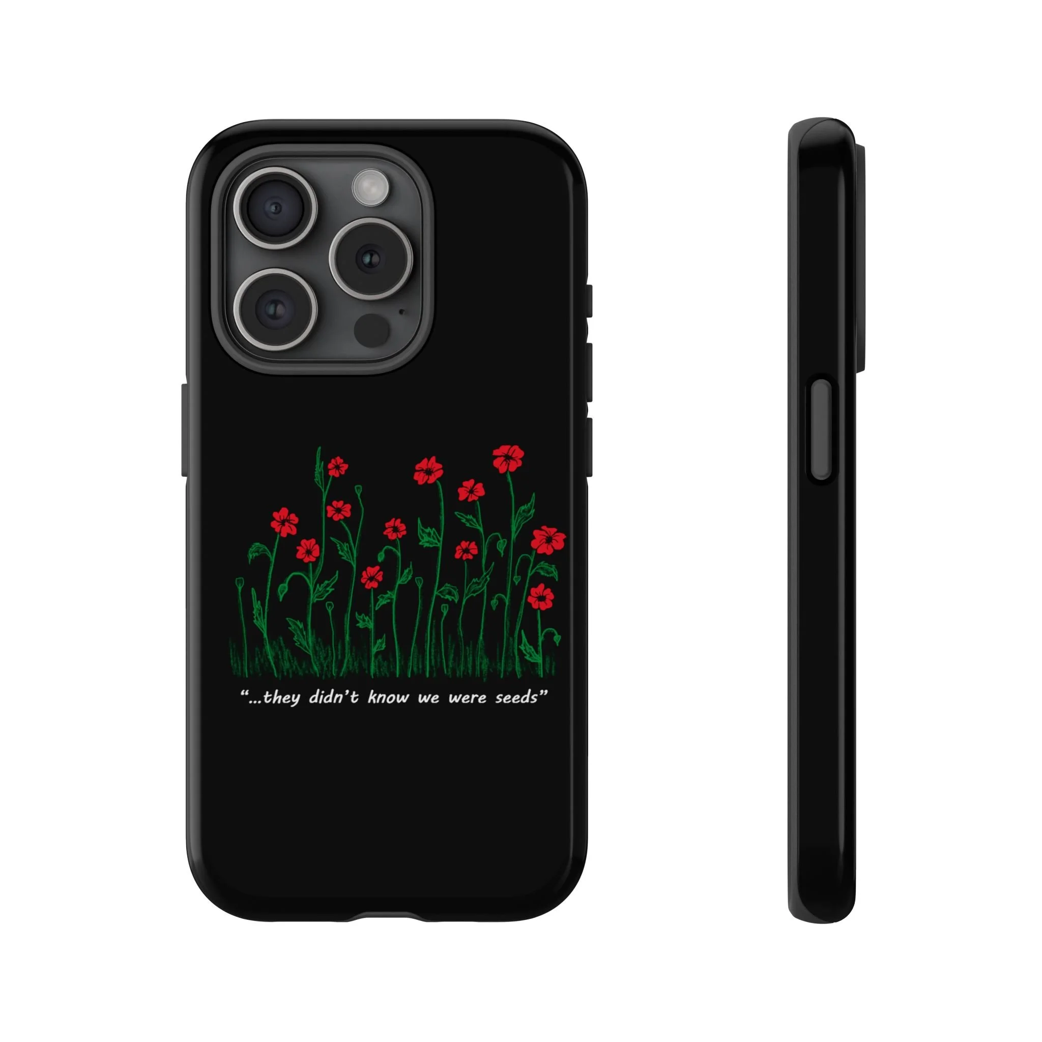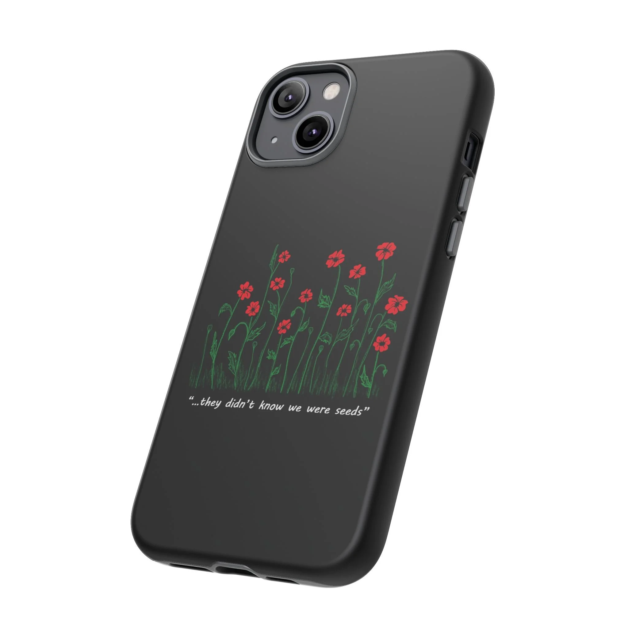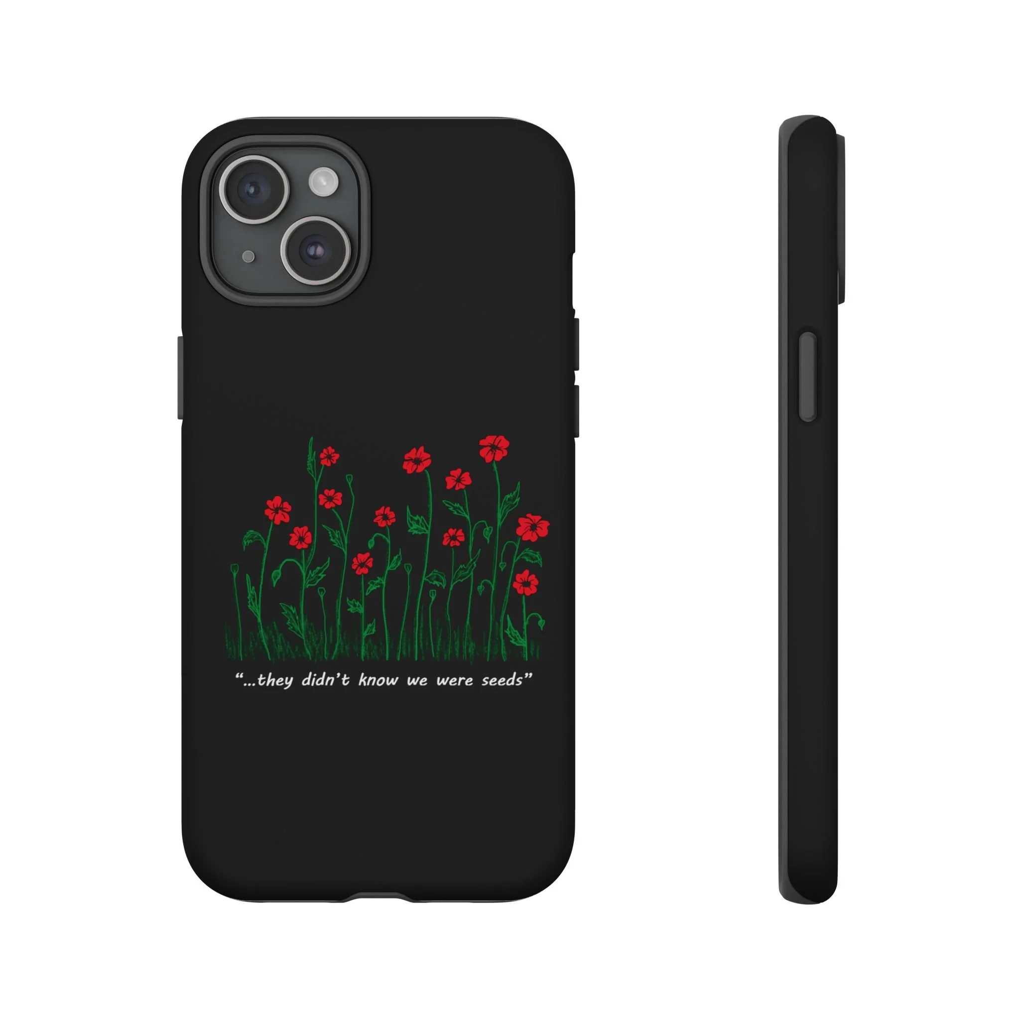 A slim, dual-layer phone case that carries a quiet, defiant charm — delicate red blossoms rising against a deep black backdrop with the small, resonant line: “...they didn’t know we were seeds.” The glossy or matte finish lets the rich 3D-wrapped print stand out while the TPU silicone inner liner cushions daily bumps and drops. This case keeps your device looking artful and guarded: clear cutouts for ports, wireless charging compatibility, and outdoor-resistant UV protection maintain the image and function through everyday use. Thoughtful compliance and durable materials make it a reliable everyday companion for someone who finds strength in subtlety. Speak truth to power with this powerful message. Please reach out if you don't see your phone type and it will get added.