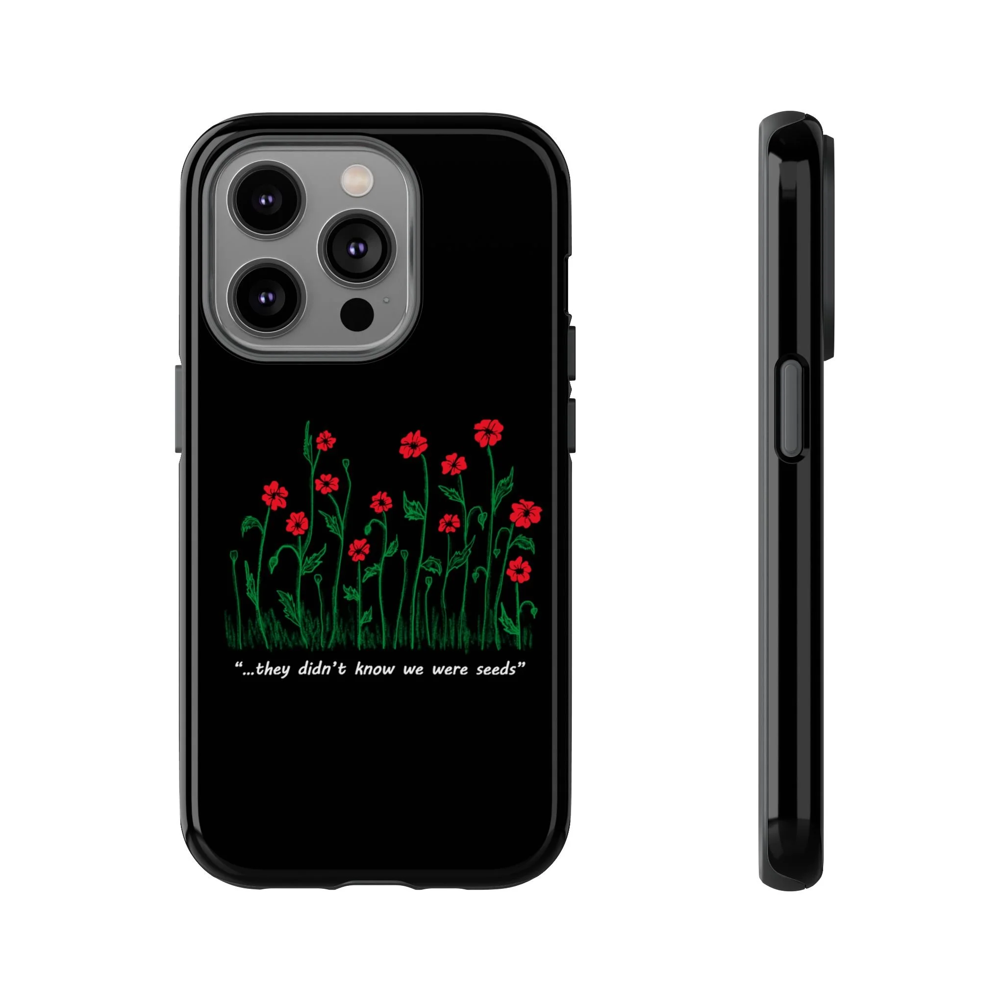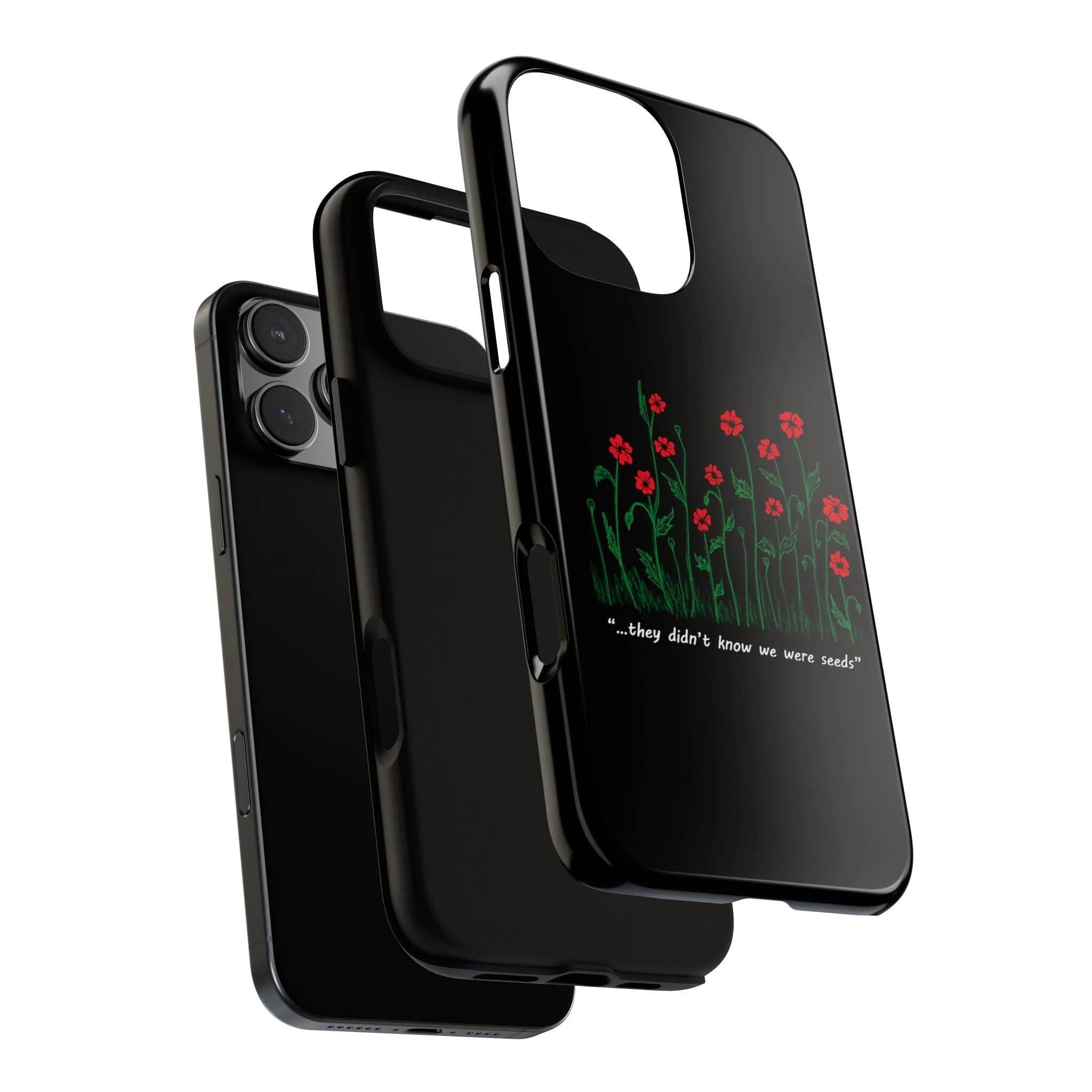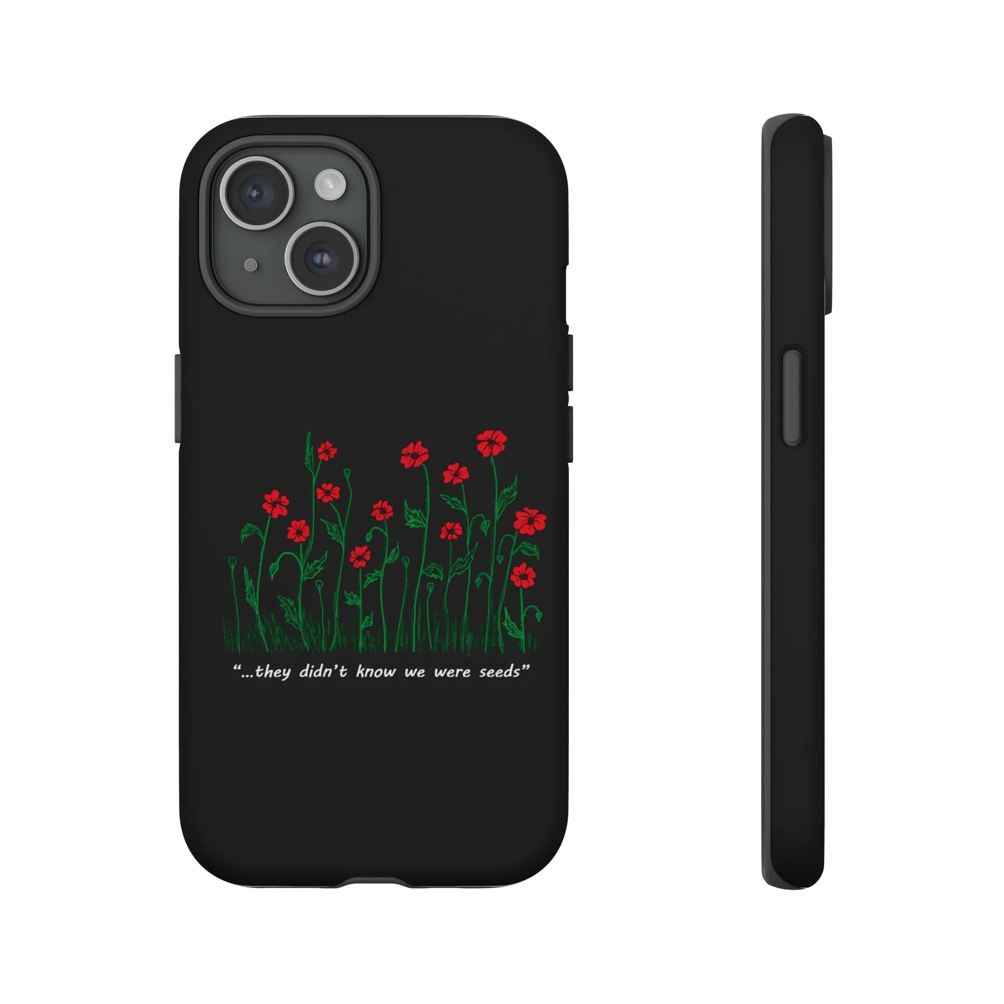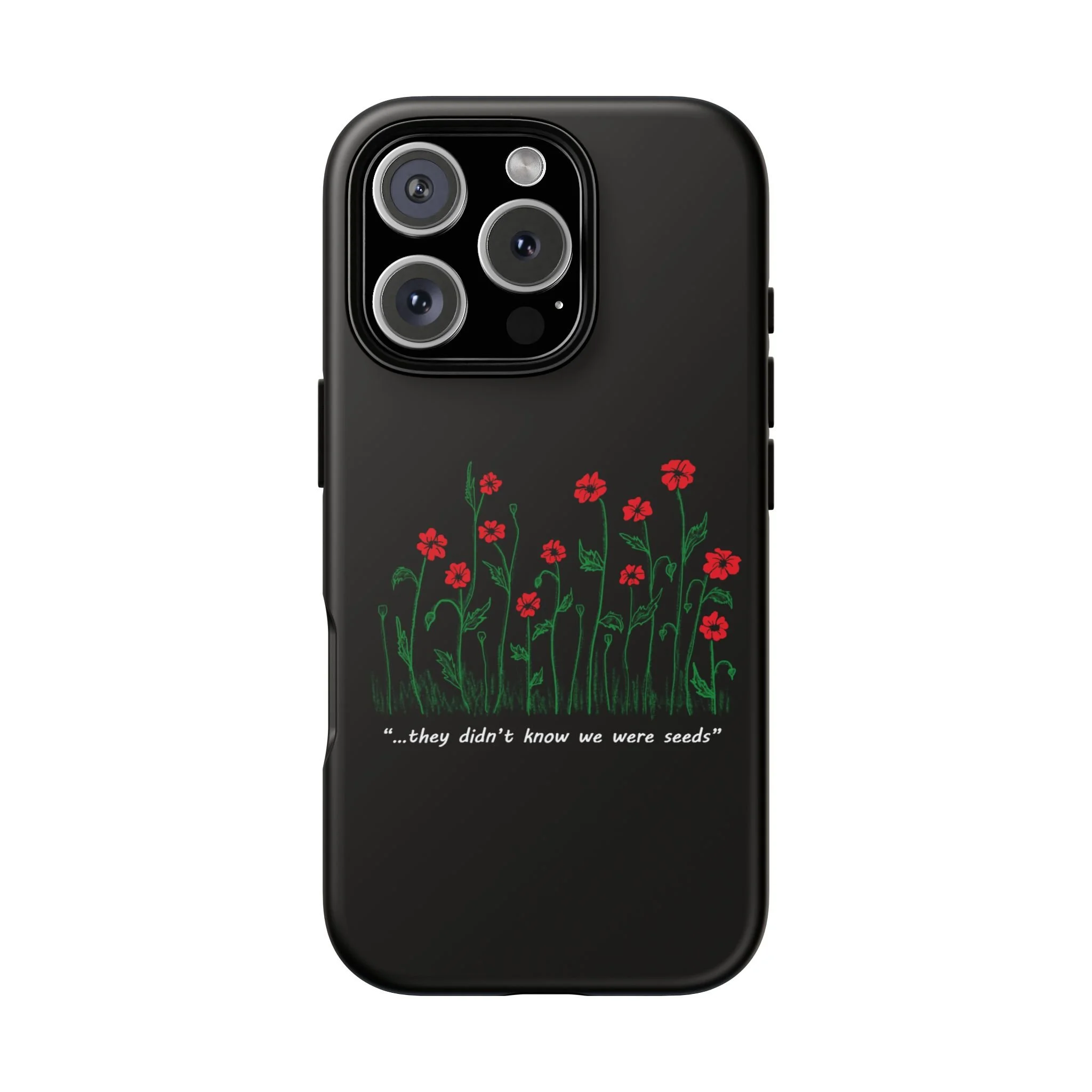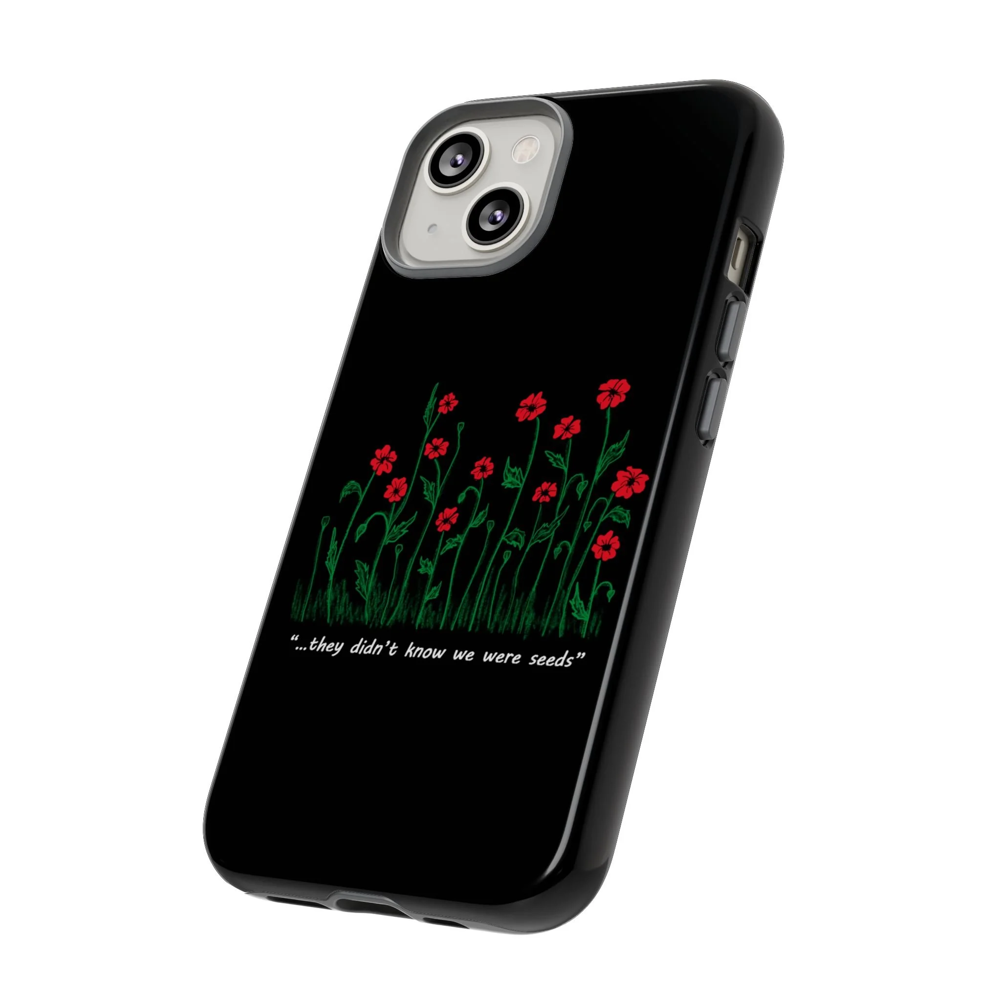 A slim, dual-layer phone case that carries a quiet, defiant charm — delicate red blossoms rising against a deep black backdrop with the small, resonant line: “...they didn’t know we were seeds.” The glossy or matte finish lets the rich 3D-wrapped print stand out while the TPU silicone inner liner cushions daily bumps and drops. This case keeps your device looking artful and guarded: clear cutouts for ports, wireless charging compatibility, and outdoor-resistant UV protection maintain the image and function through everyday use. Thoughtful compliance and durable materials make it a reliable everyday companion for someone who finds strength in subtlety. Speak truth to power with this powerful message. Please reach out if you don't see your phone type and it will get added.
