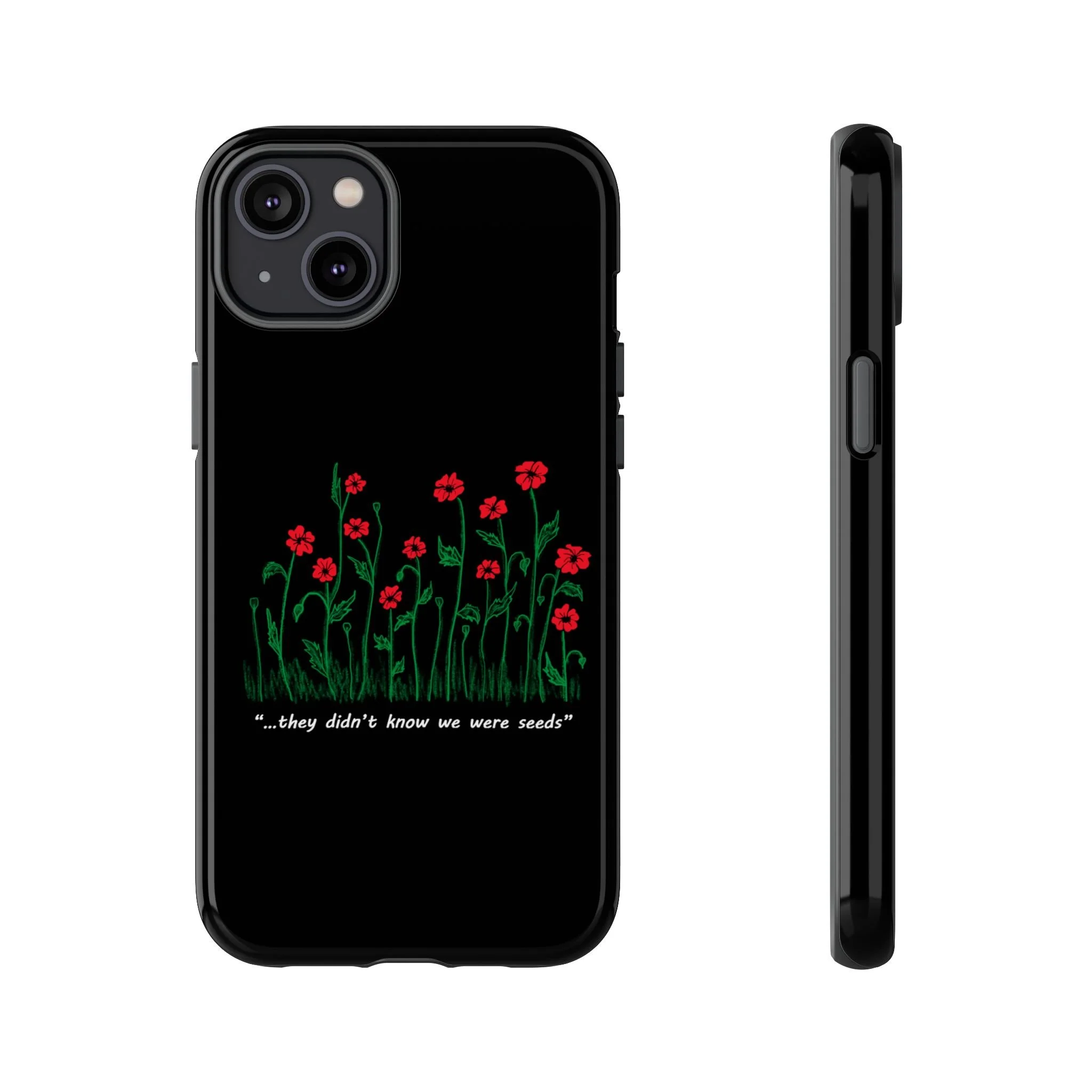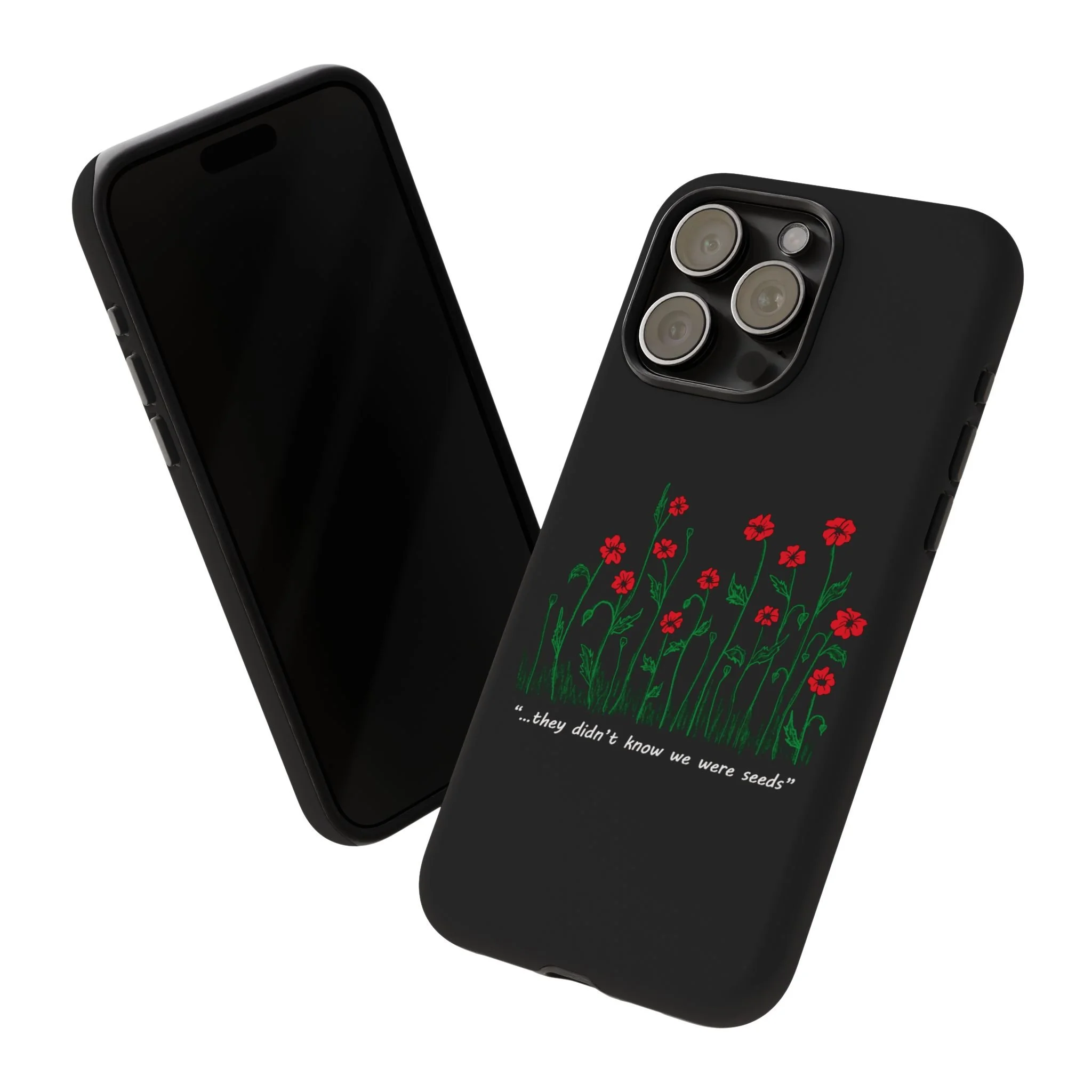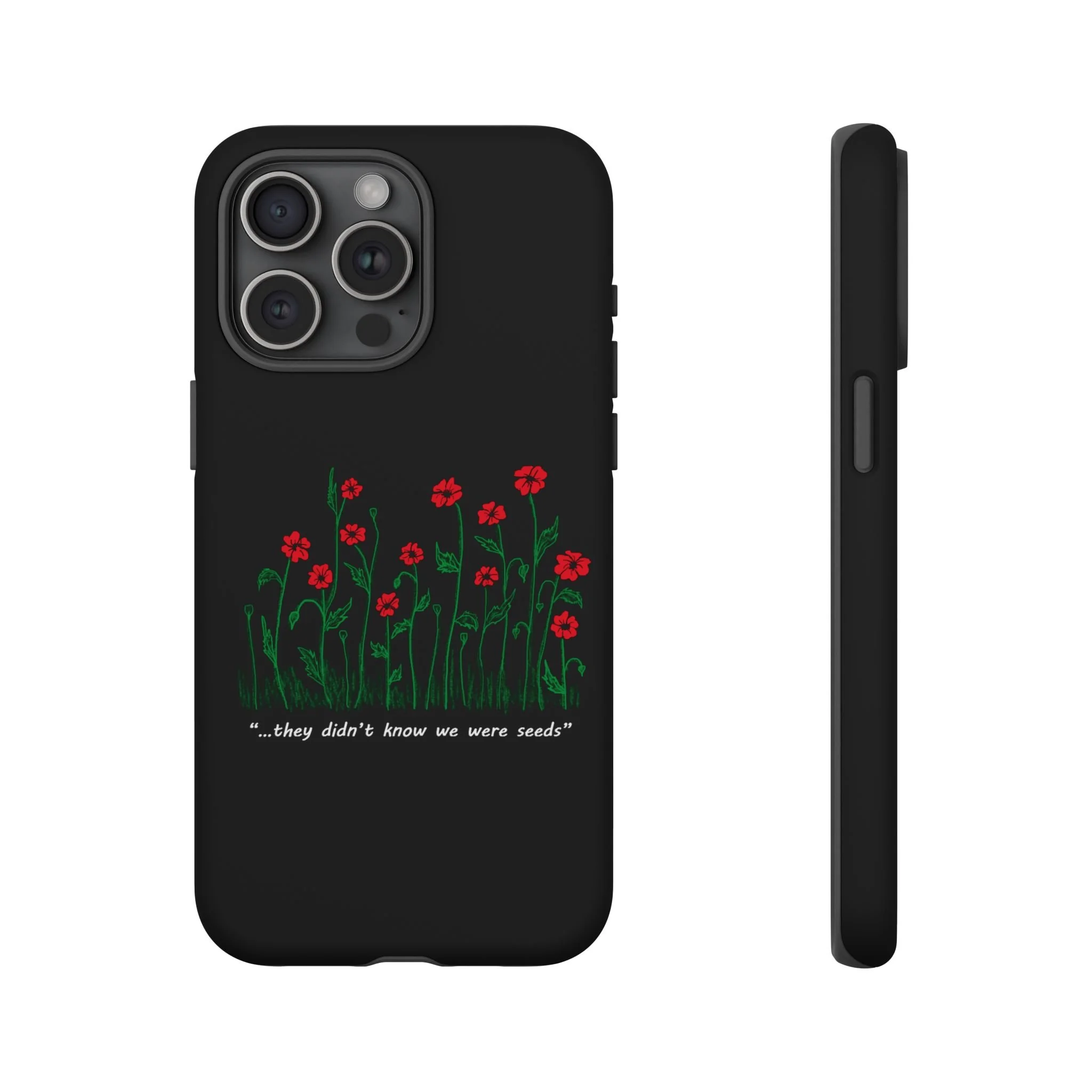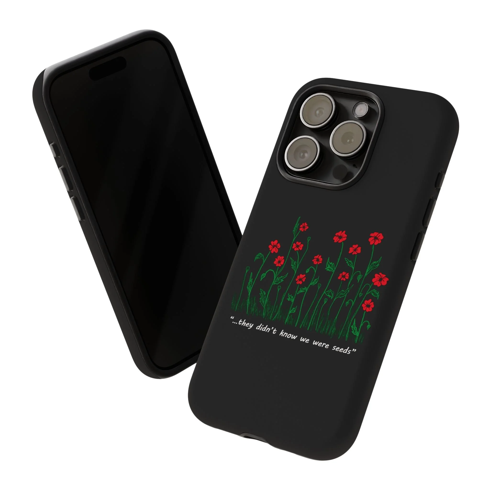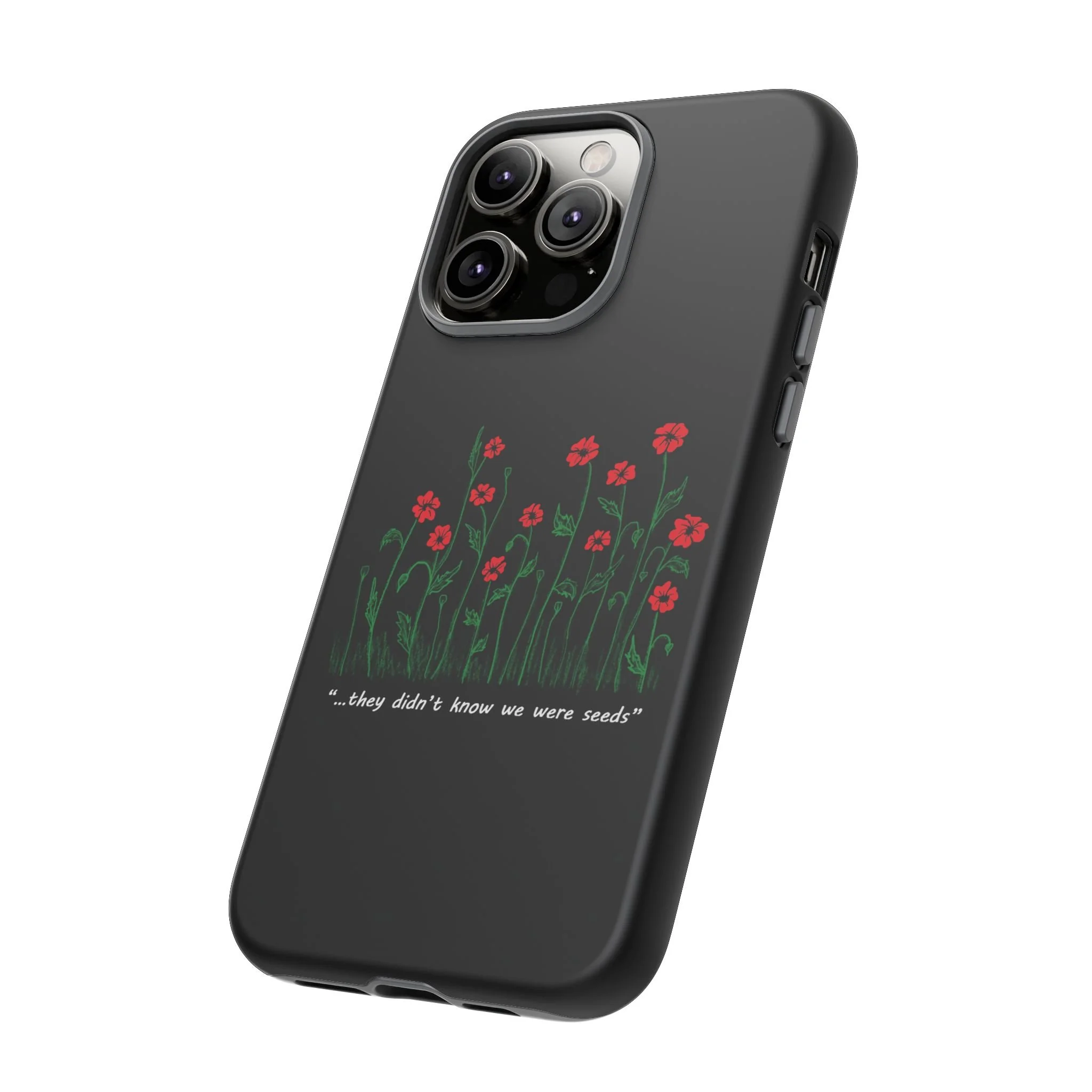 A slim, dual-layer phone case that carries a quiet, defiant charm — delicate red blossoms rising against a deep black backdrop with the small, resonant line: “...they didn’t know we were seeds.” The glossy or matte finish lets the rich 3D-wrapped print stand out while the TPU silicone inner liner cushions daily bumps and drops. This case keeps your device looking artful and guarded: clear cutouts for ports, wireless charging compatibility, and outdoor-resistant UV protection maintain the image and function through everyday use. Thoughtful compliance and durable materials make it a reliable everyday companion for someone who finds strength in subtlety. Speak truth to power with this powerful message. Please reach out if you don't see your phone type and it will get added.
