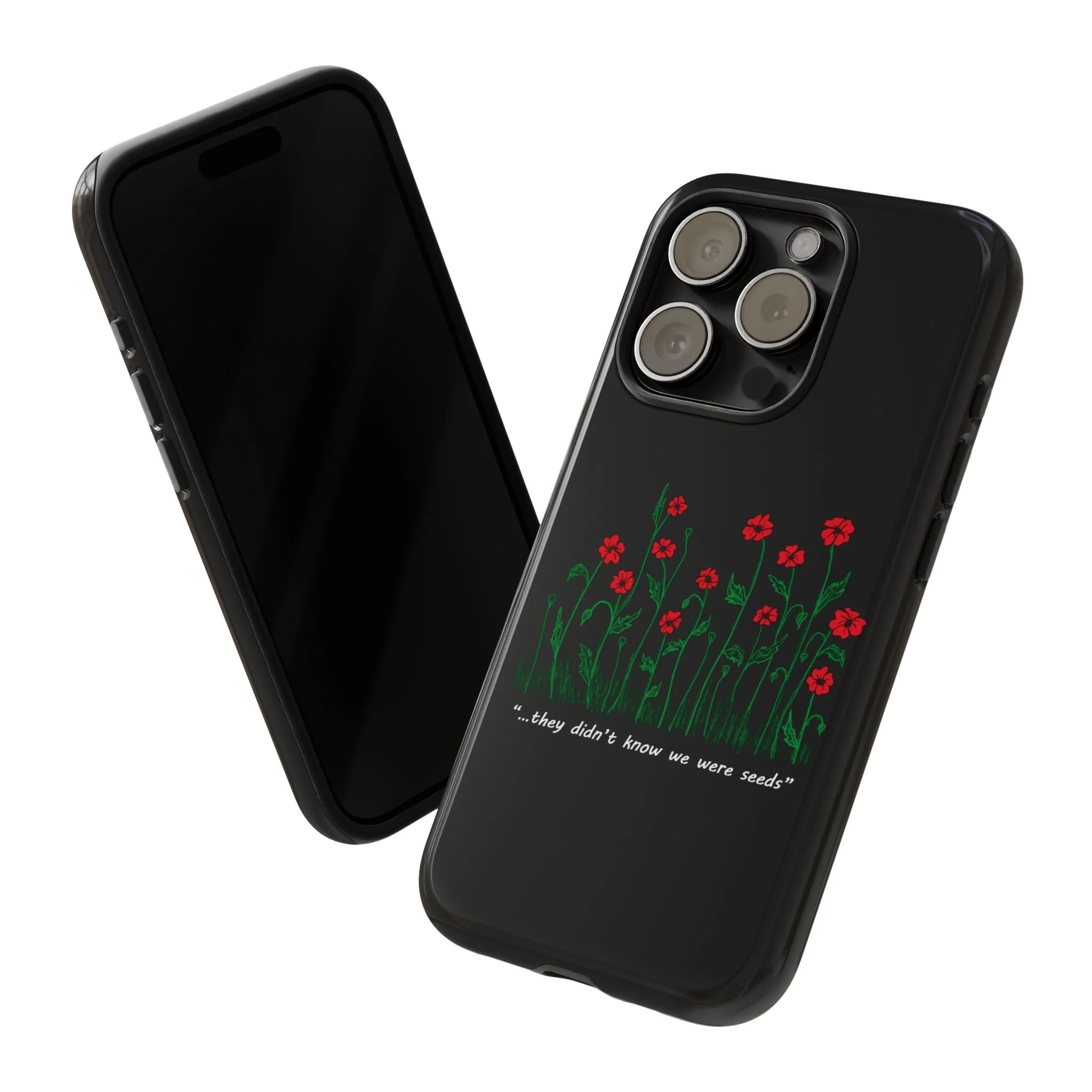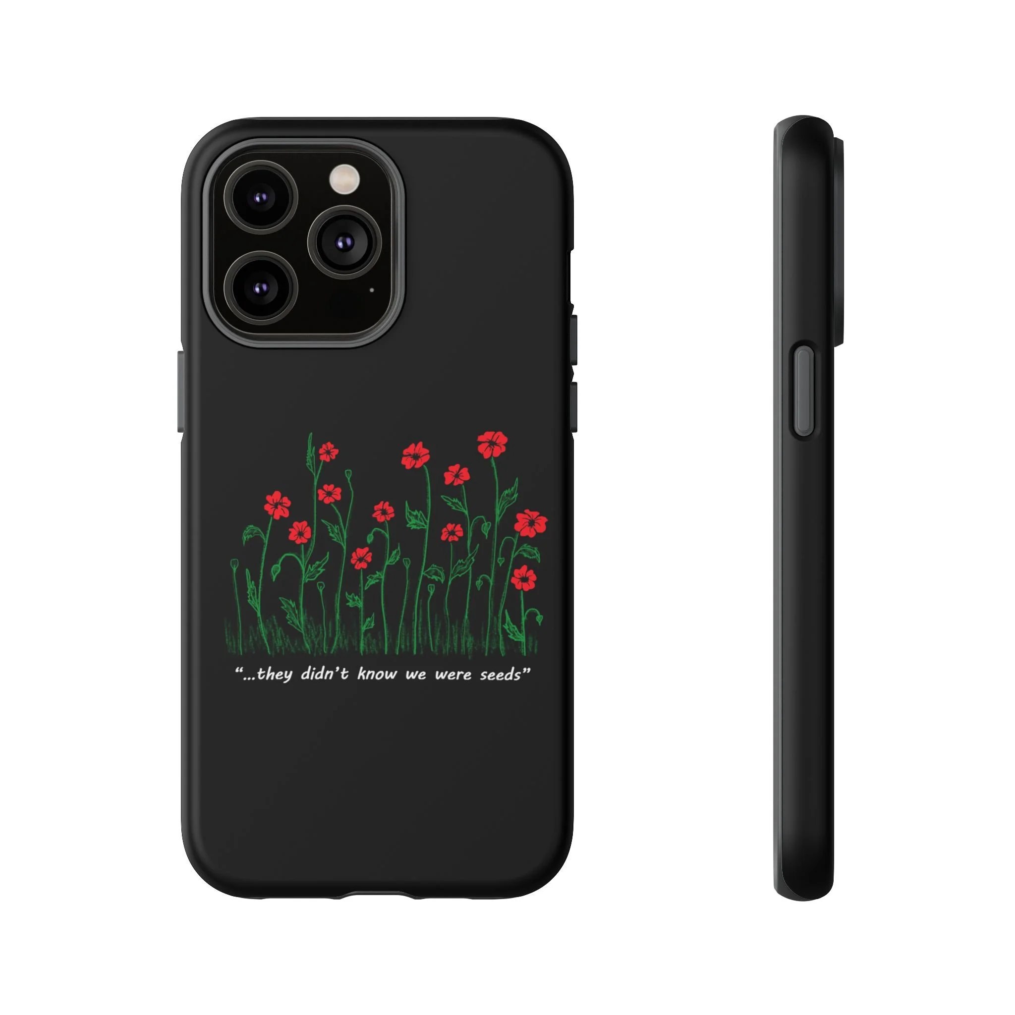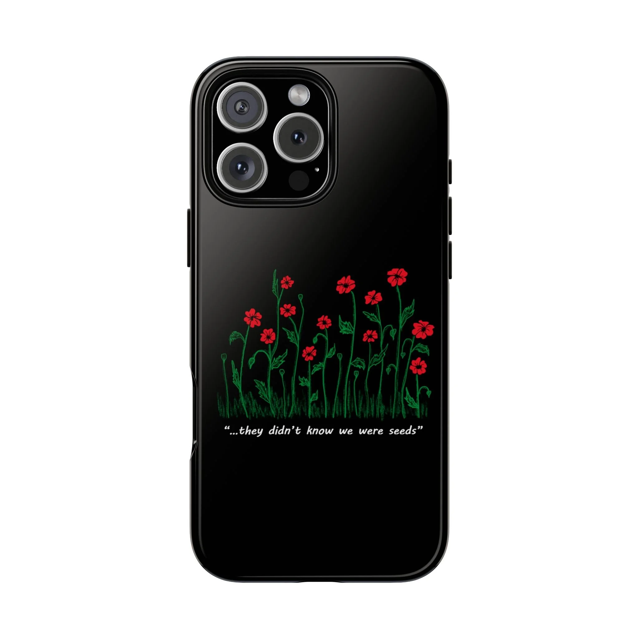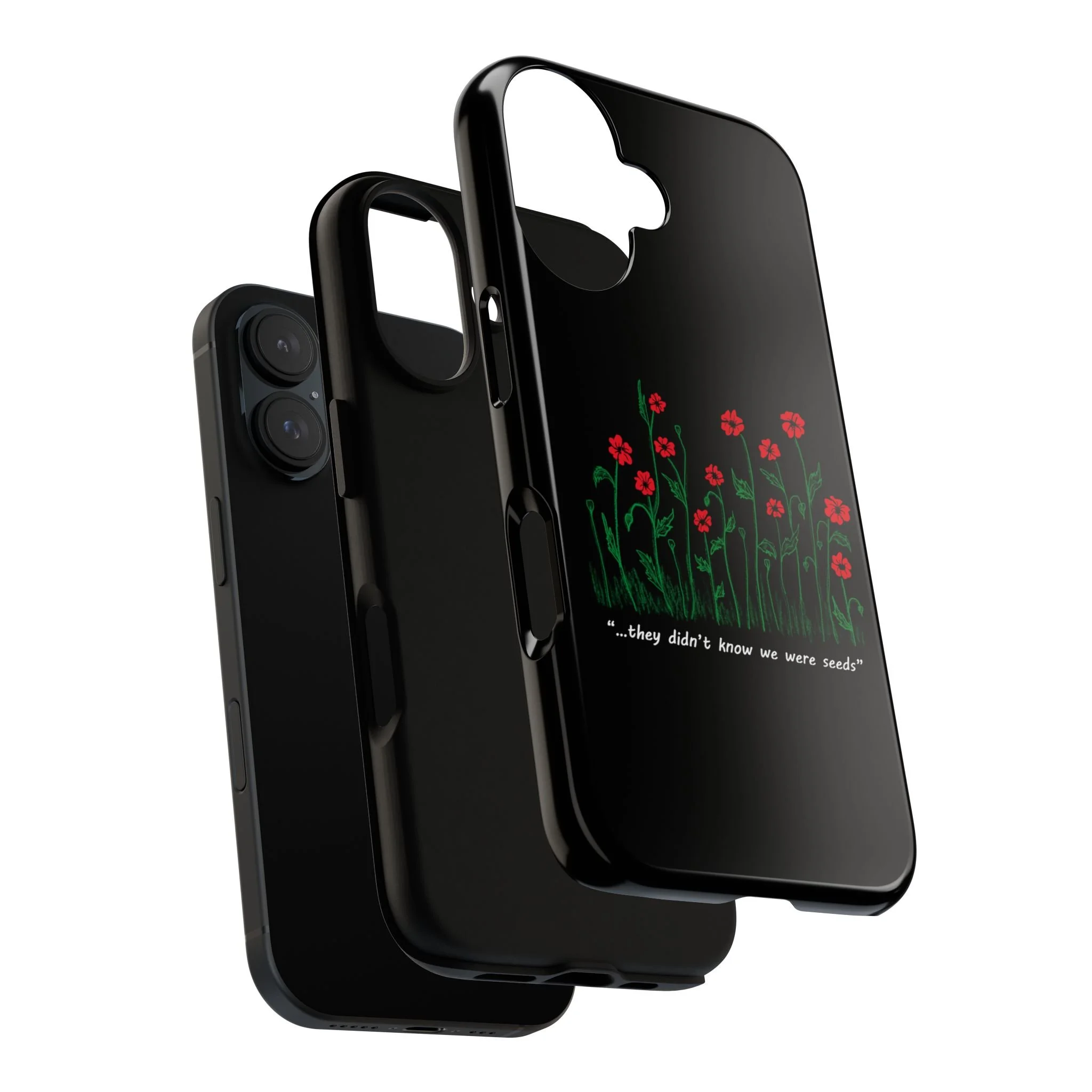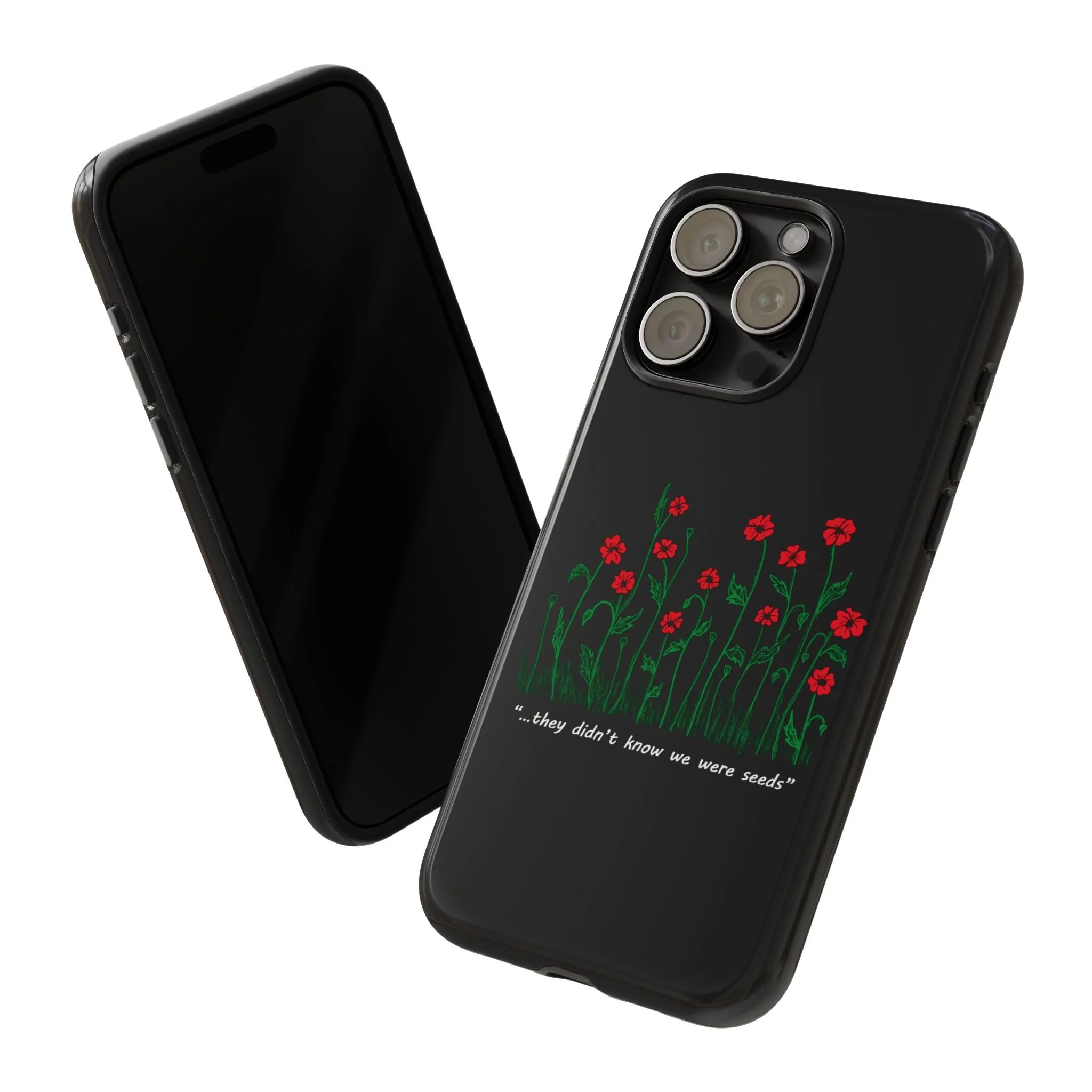 A slim, dual-layer phone case that carries a quiet, defiant charm — delicate red blossoms rising against a deep black backdrop with the small, resonant line: “...they didn’t know we were seeds.” The glossy or matte finish lets the rich 3D-wrapped print stand out while the TPU silicone inner liner cushions daily bumps and drops. This case keeps your device looking artful and guarded: clear cutouts for ports, wireless charging compatibility, and outdoor-resistant UV protection maintain the image and function through everyday use. Thoughtful compliance and durable materials make it a reliable everyday companion for someone who finds strength in subtlety. Speak truth to power with this powerful message. Please reach out if you don't see your phone type and it will get added.
