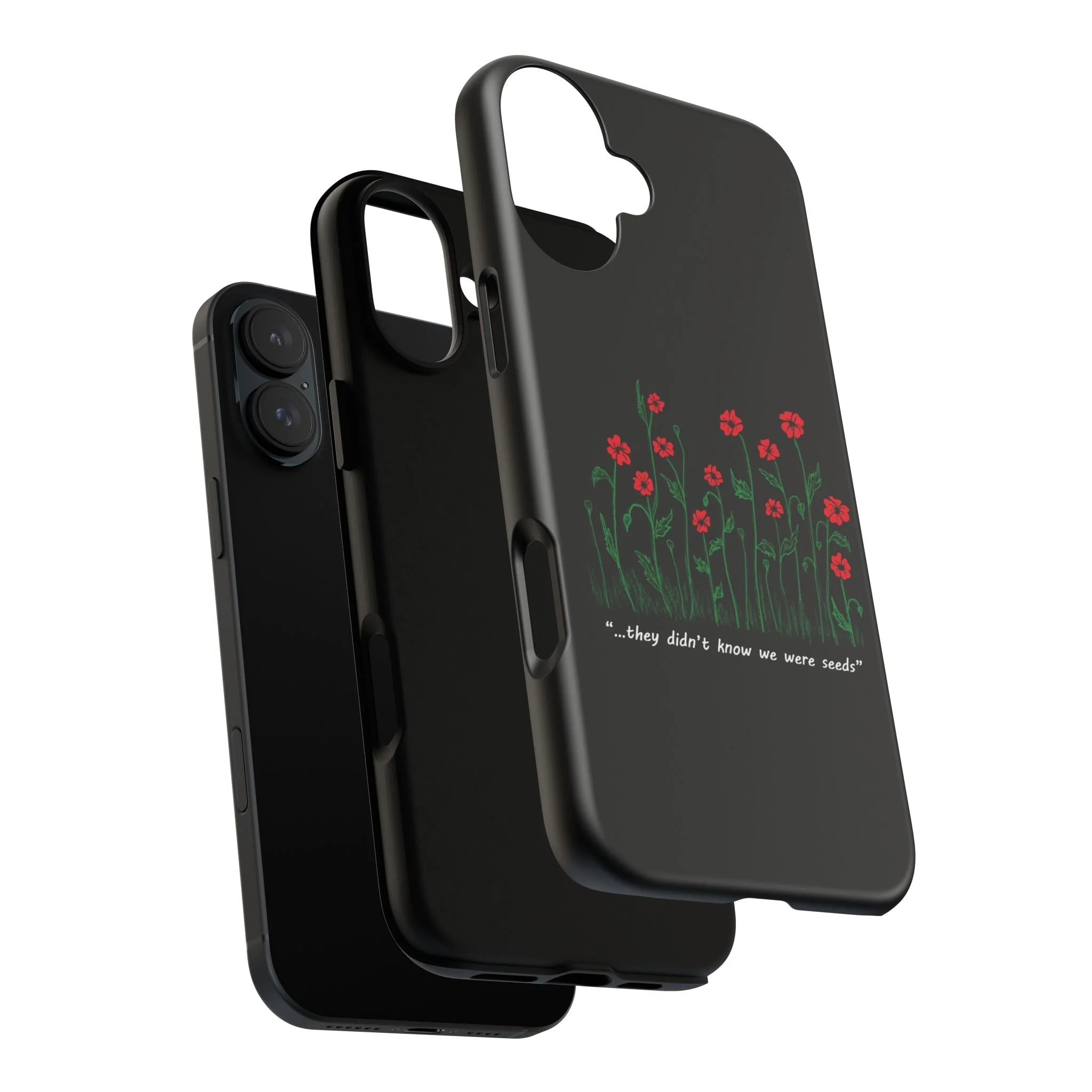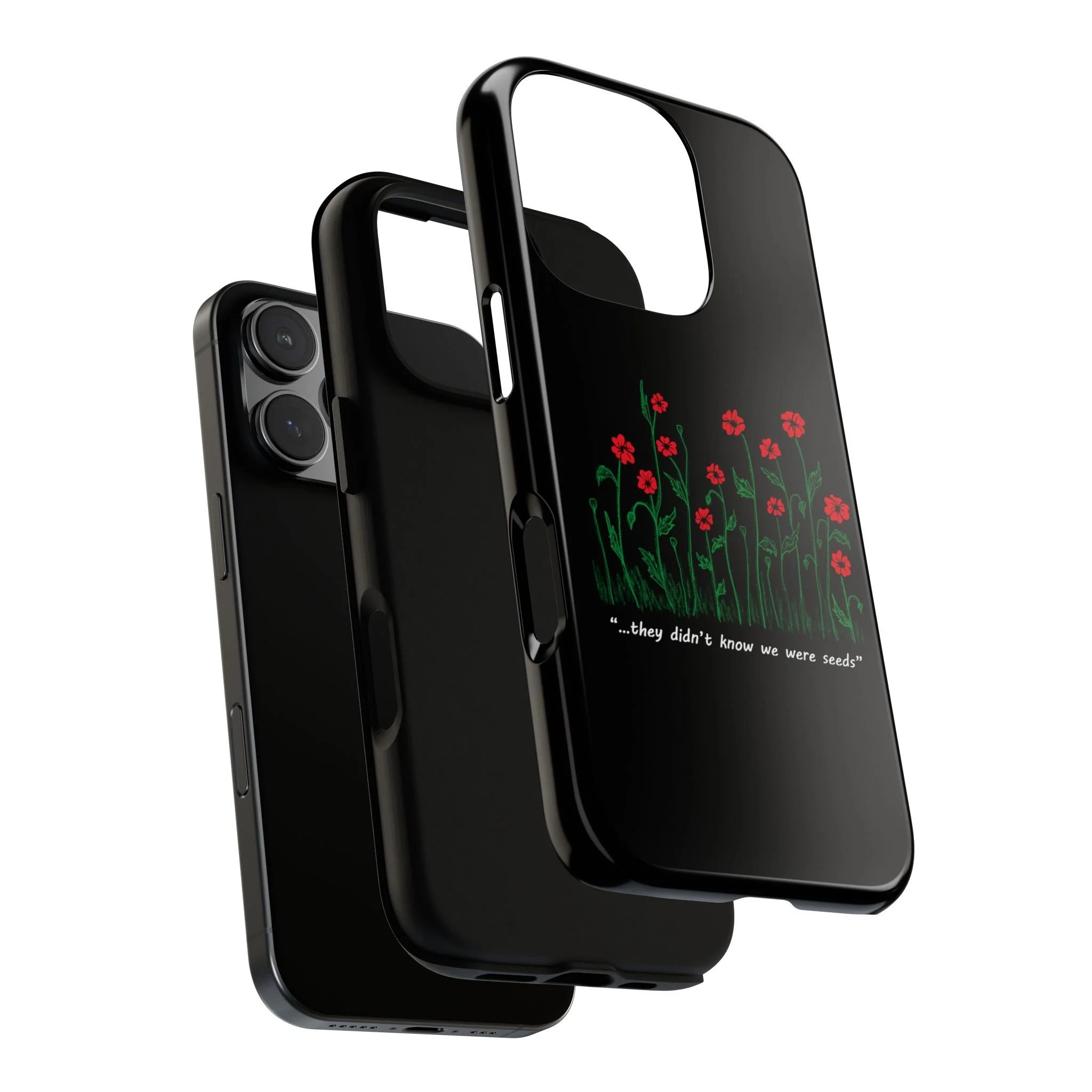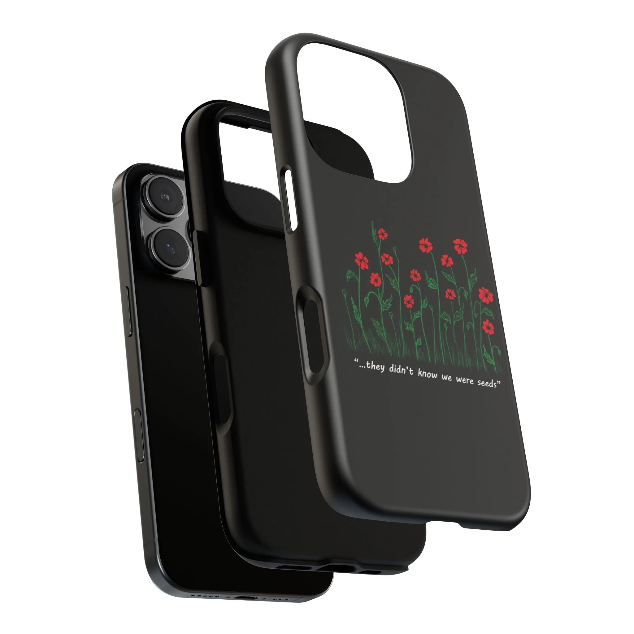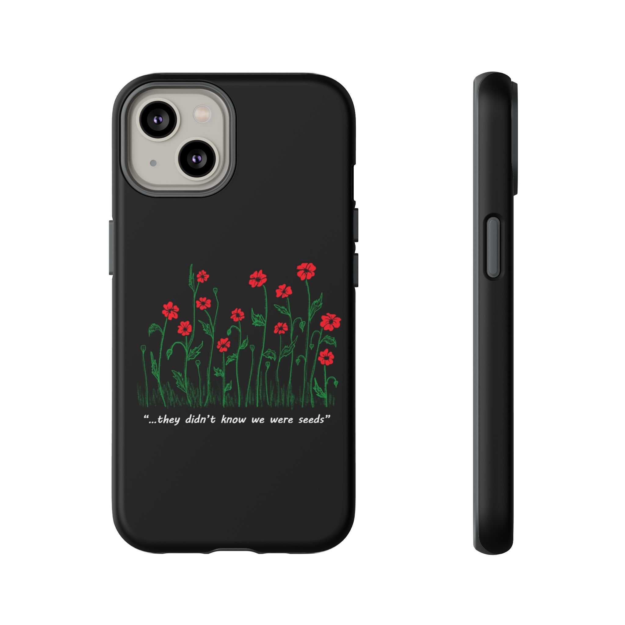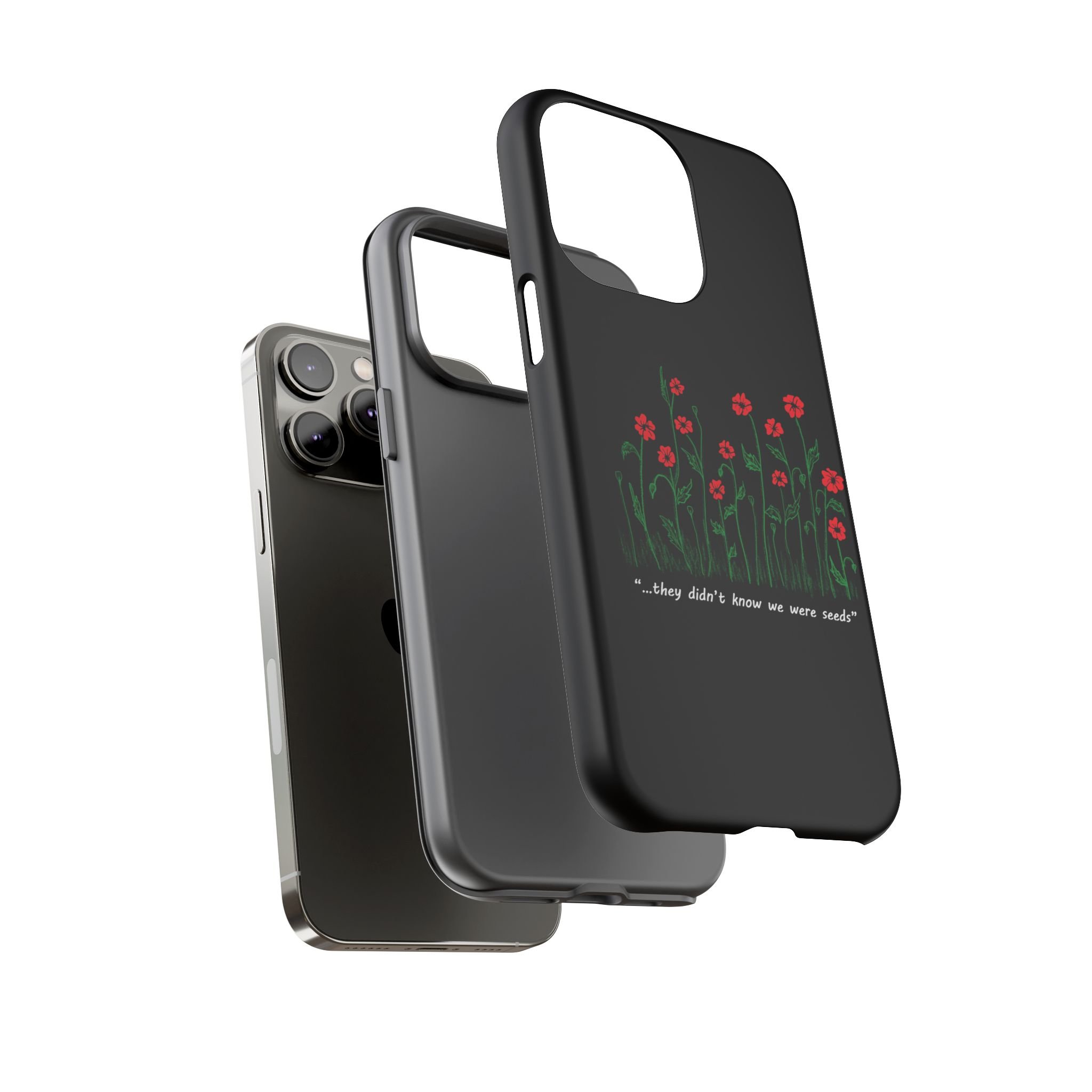A slim, dual-layer phone case that carries a quiet, defiant charm — delicate red blossoms rising against a deep black backdrop with the small, resonant line: “...they didn’t know we were seeds.” The glossy or matte finish lets the rich 3D-wrapped print stand out while the TPU silicone inner liner cushions daily bumps and drops. This case keeps your device looking artful and guarded: clear cutouts for ports, wireless charging compatibility, and outdoor-resistant UV protection maintain the image and function through everyday use. Thoughtful compliance and durable materials make it a reliable everyday companion for someone who finds strength in subtlety. Speak truth to power with this powerful message. Please reach out if you don't see your phone type and it will get added.