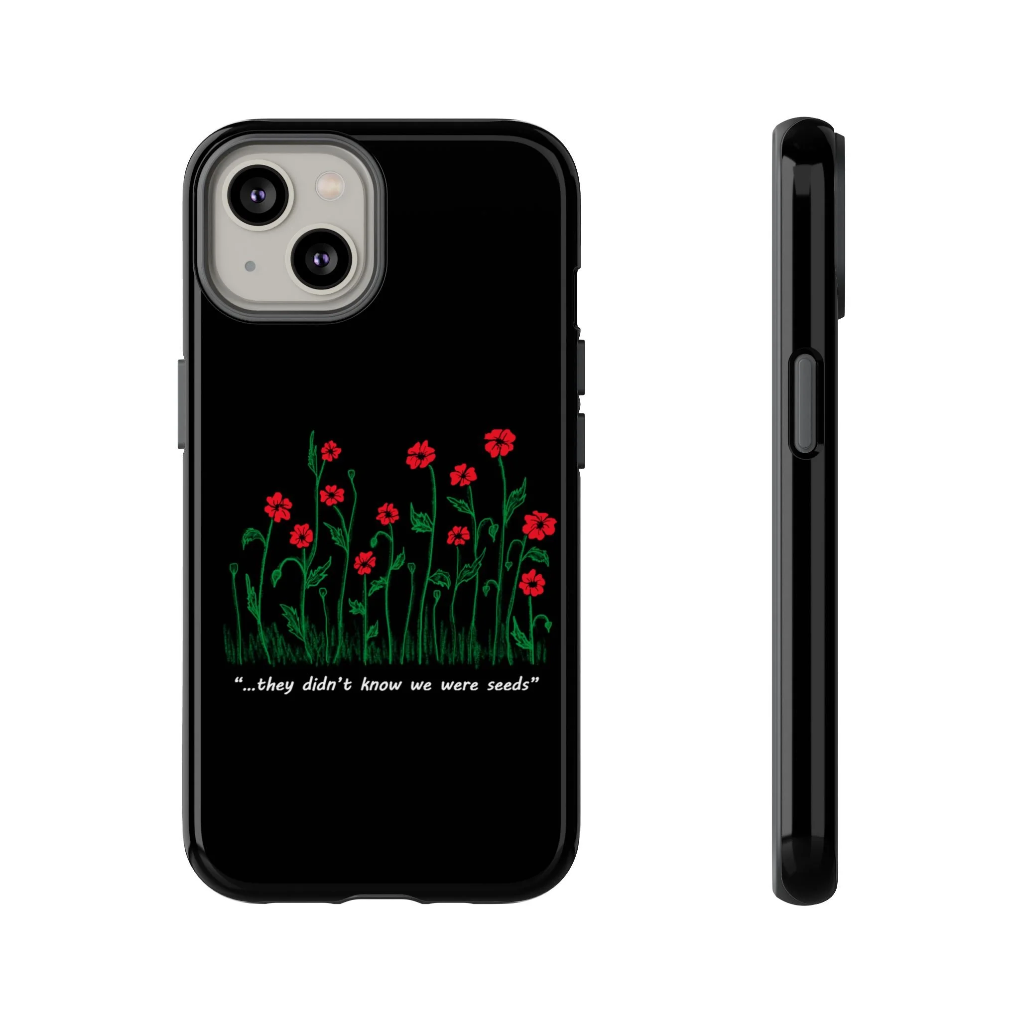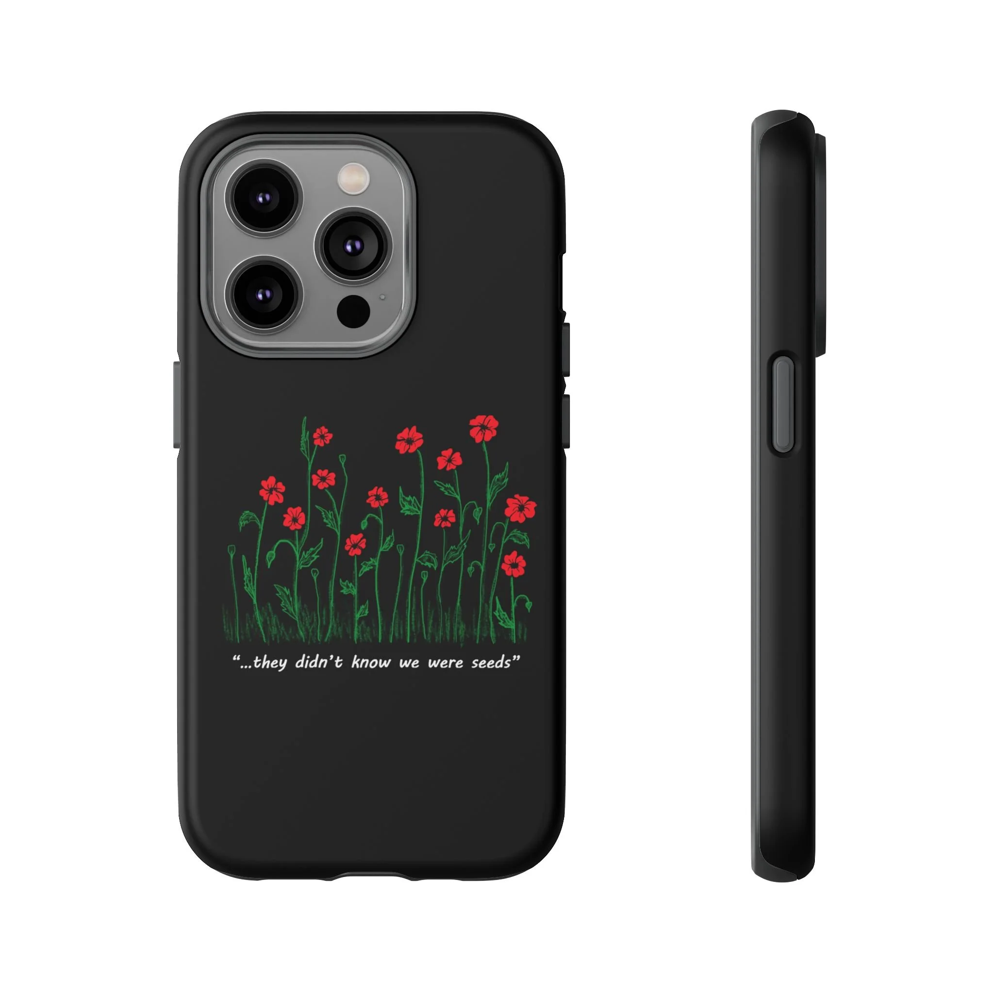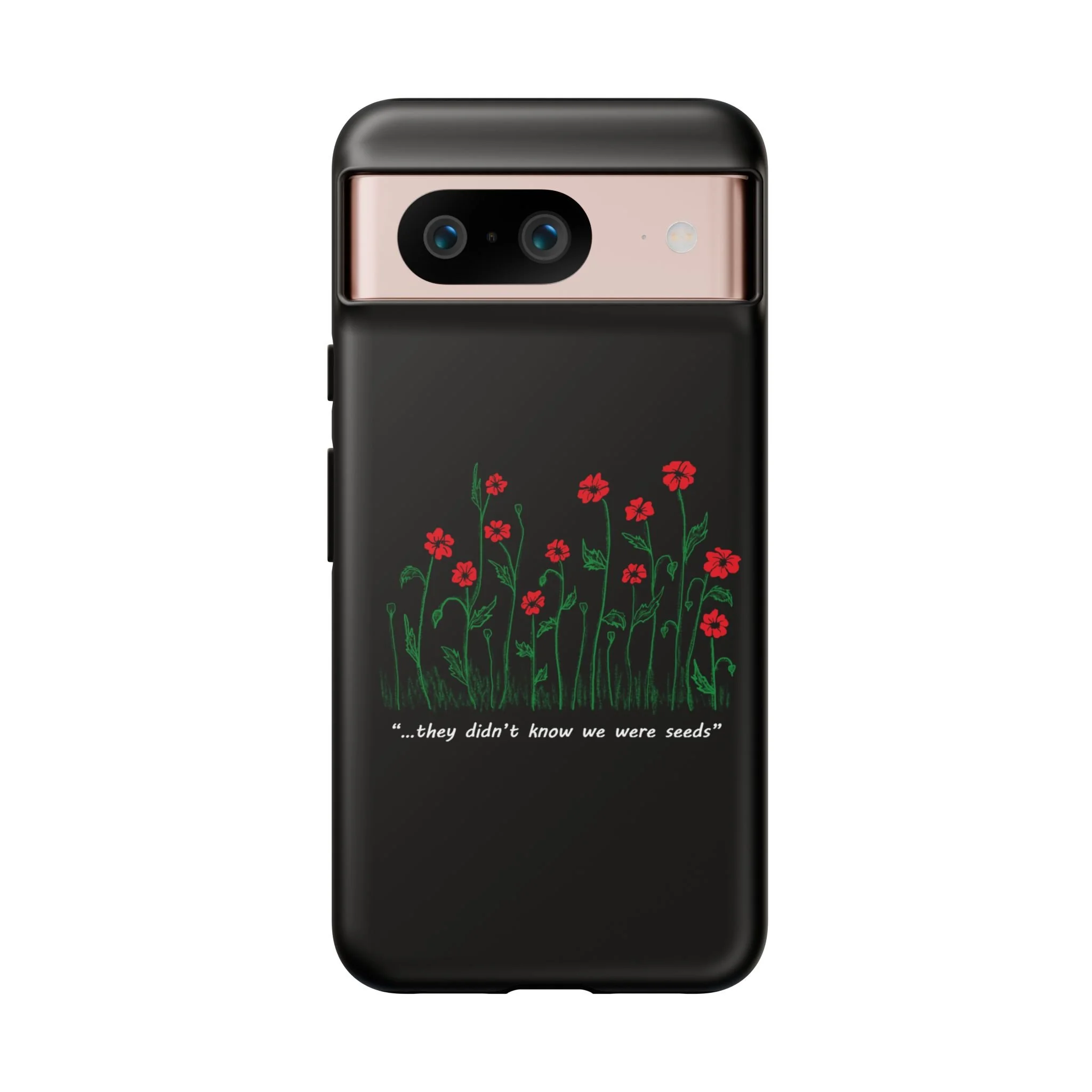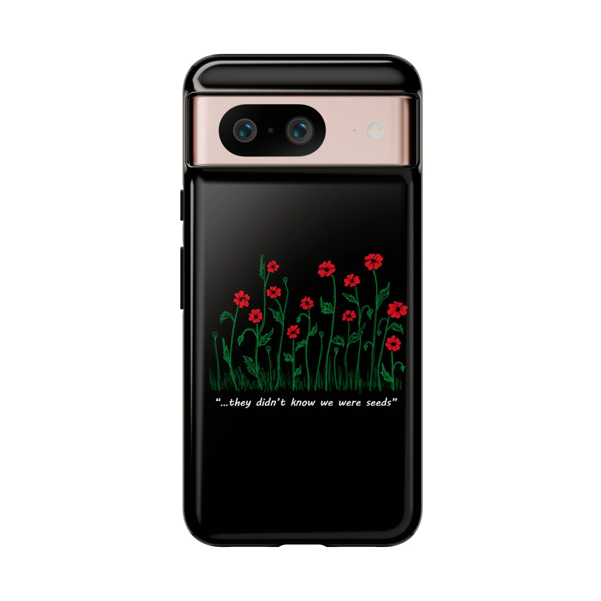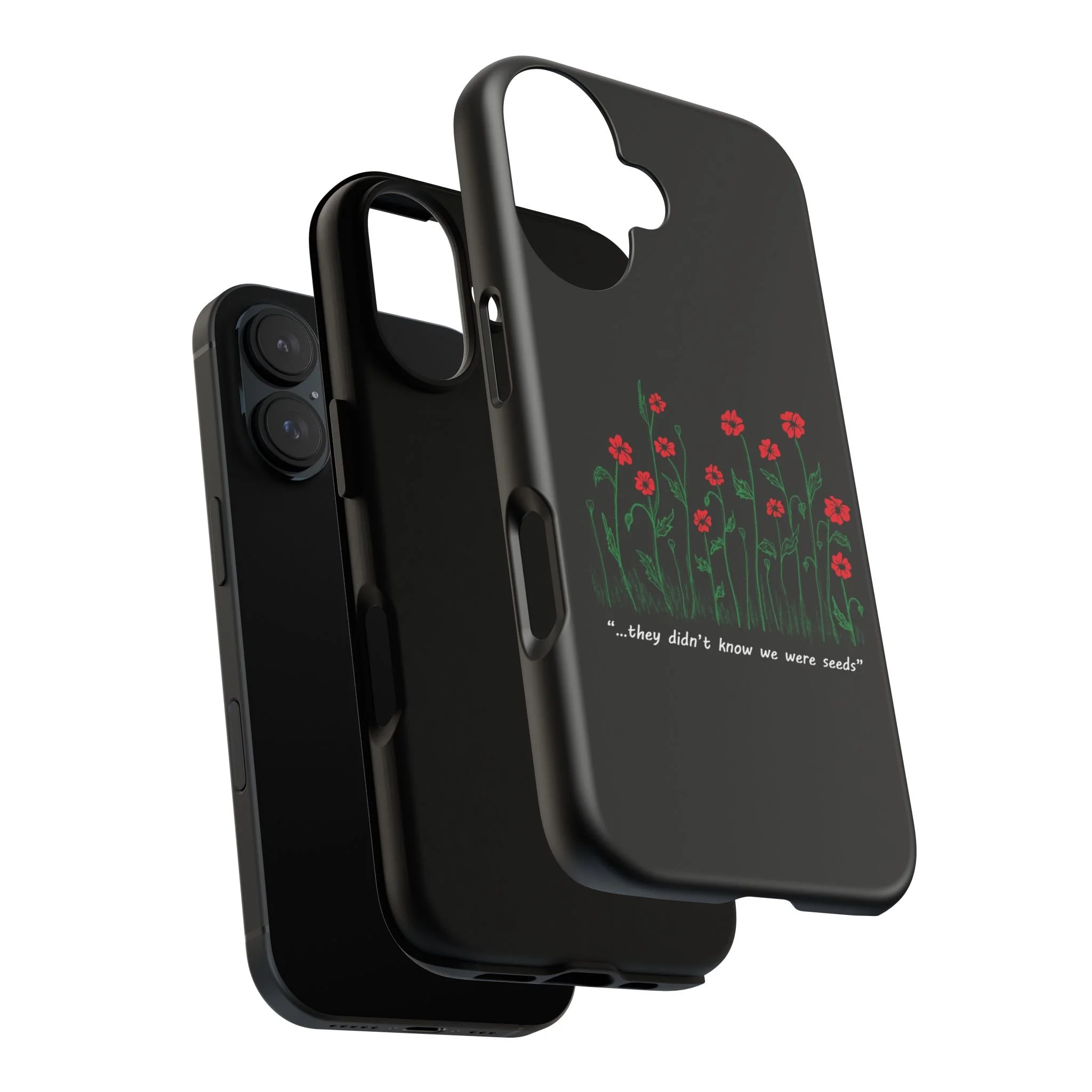 A slim, dual-layer phone case that carries a quiet, defiant charm — delicate red blossoms rising against a deep black backdrop with the small, resonant line: “...they didn’t know we were seeds.” The glossy or matte finish lets the rich 3D-wrapped print stand out while the TPU silicone inner liner cushions daily bumps and drops. This case keeps your device looking artful and guarded: clear cutouts for ports, wireless charging compatibility, and outdoor-resistant UV protection maintain the image and function through everyday use. Thoughtful compliance and durable materials make it a reliable everyday companion for someone who finds strength in subtlety. Speak truth to power with this powerful message. Please reach out if you don't see your phone type and it will get added.