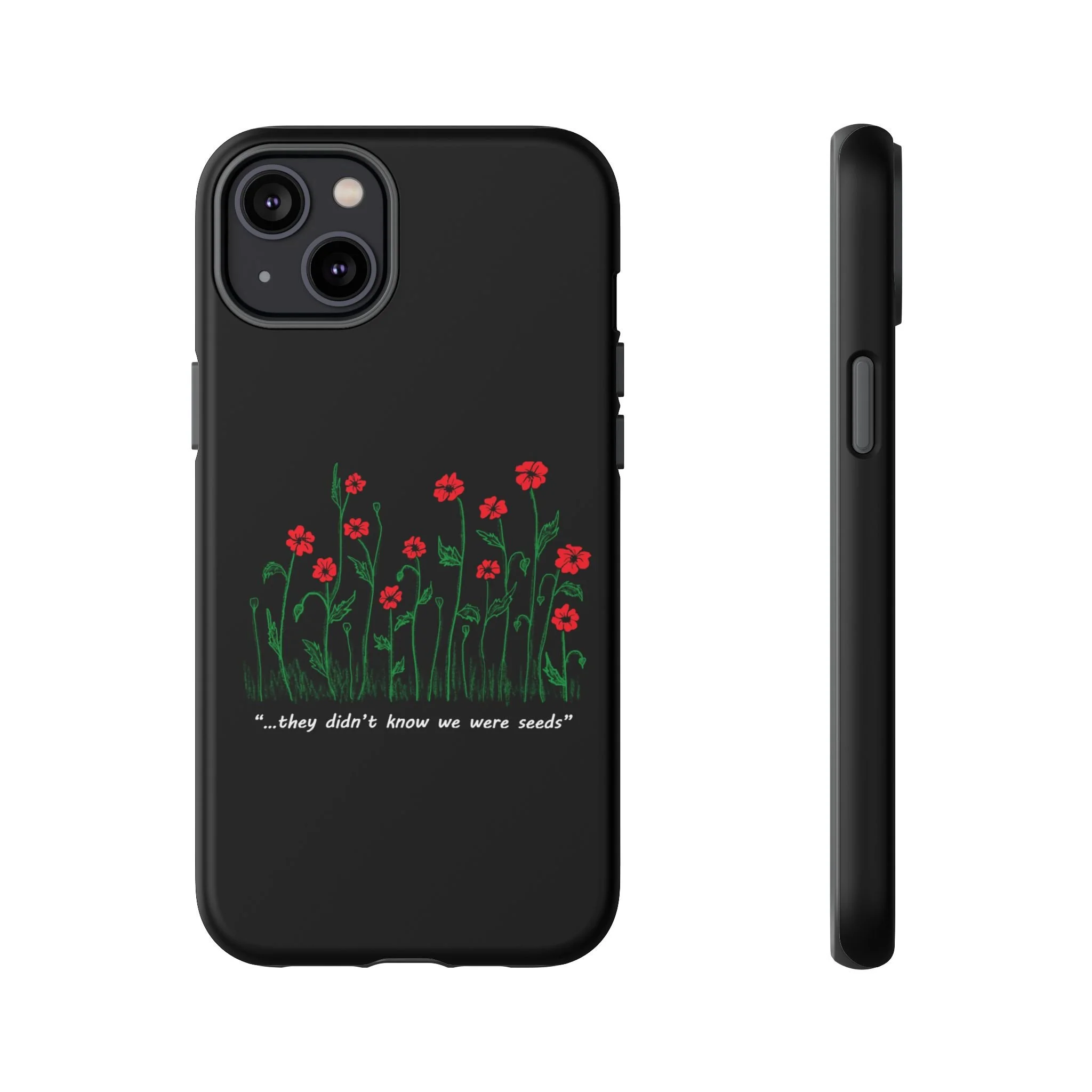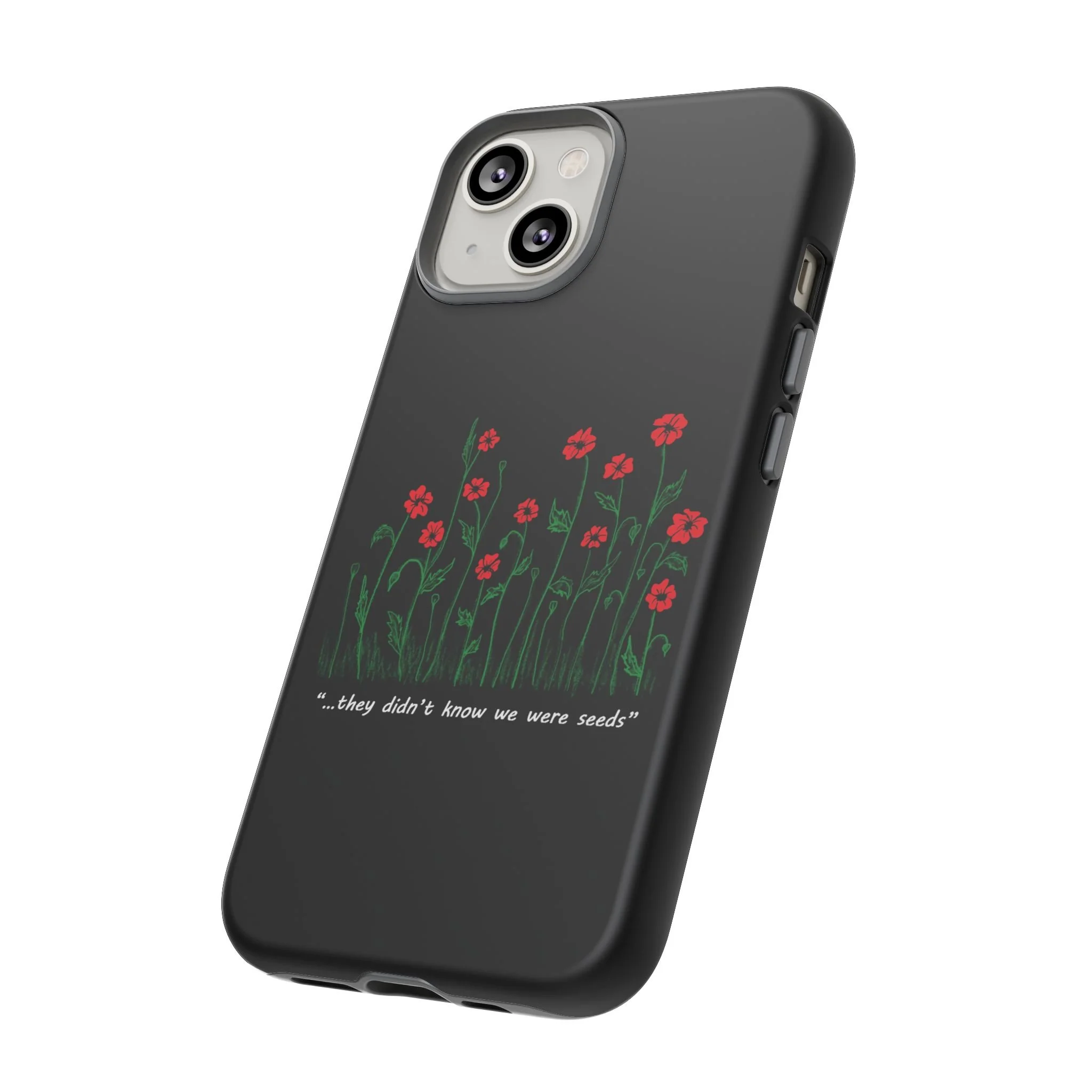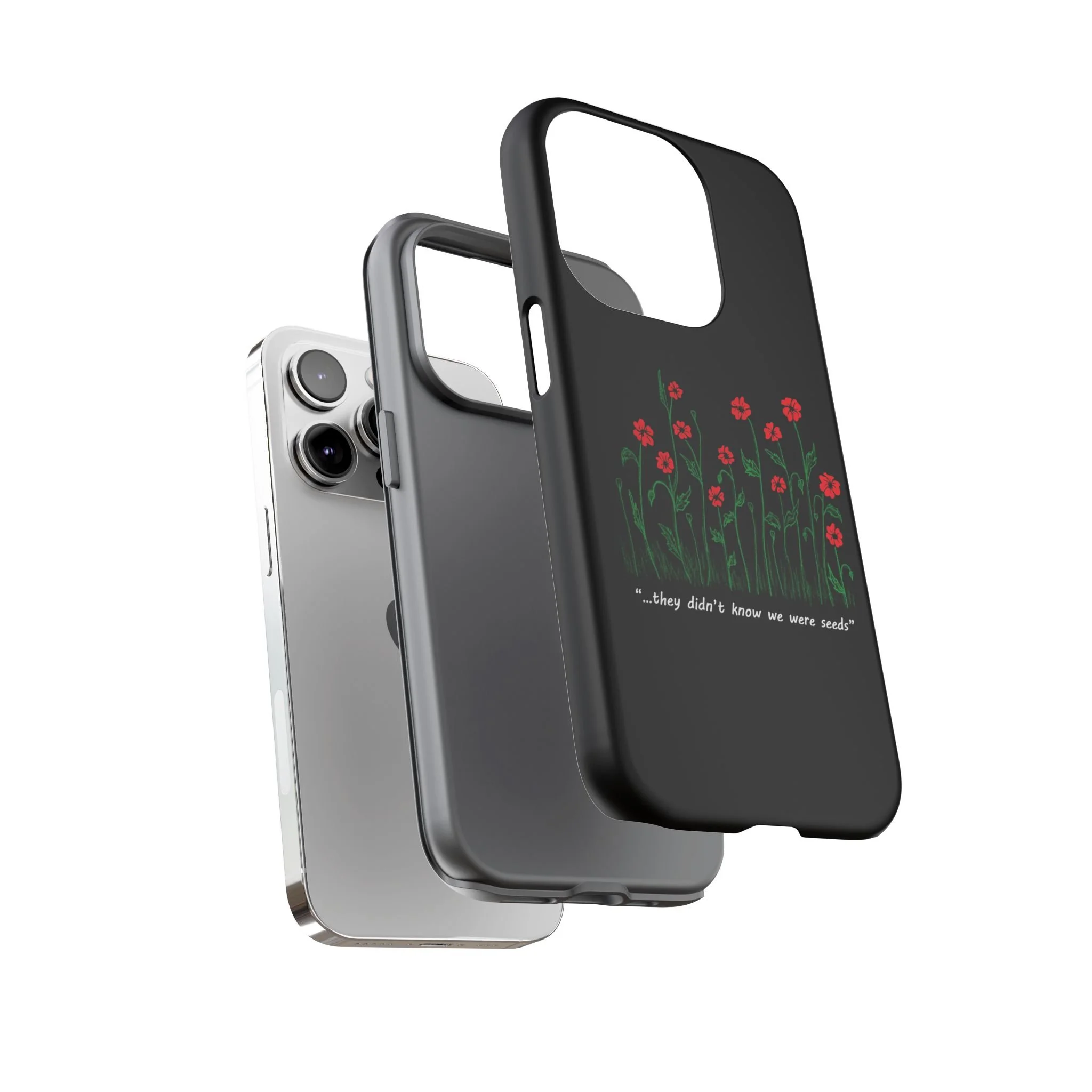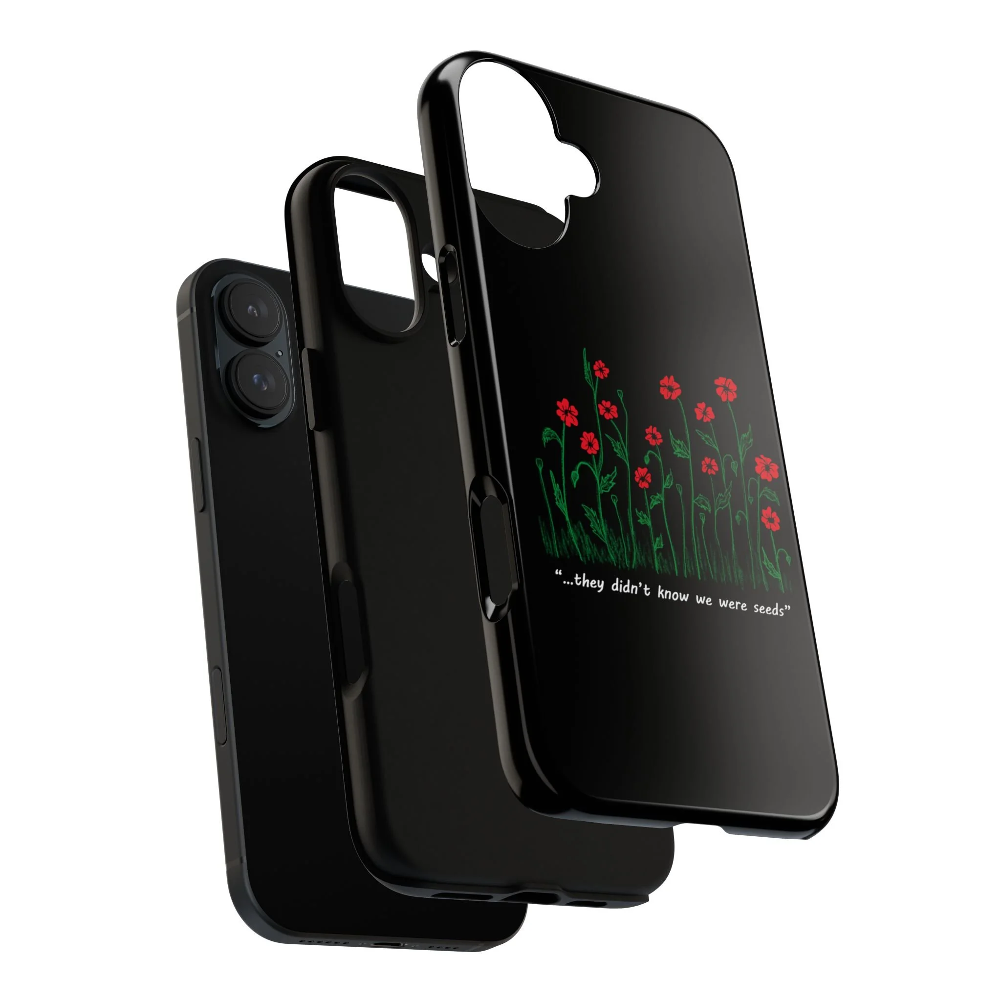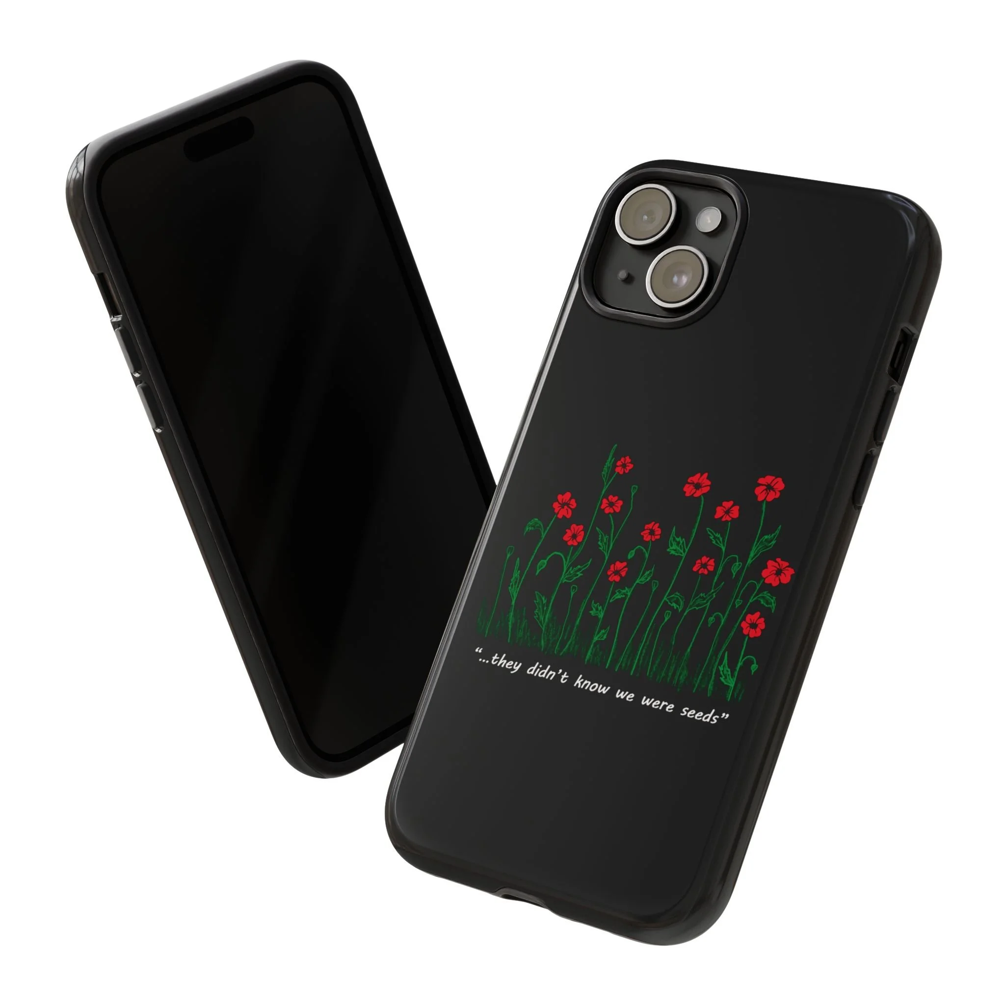 A slim, dual-layer phone case that carries a quiet, defiant charm — delicate red blossoms rising against a deep black backdrop with the small, resonant line: “...they didn’t know we were seeds.” The glossy or matte finish lets the rich 3D-wrapped print stand out while the TPU silicone inner liner cushions daily bumps and drops. This case keeps your device looking artful and guarded: clear cutouts for ports, wireless charging compatibility, and outdoor-resistant UV protection maintain the image and function through everyday use. Thoughtful compliance and durable materials make it a reliable everyday companion for someone who finds strength in subtlety. Speak truth to power with this powerful message. Please reach out if you don't see your phone type and it will get added.