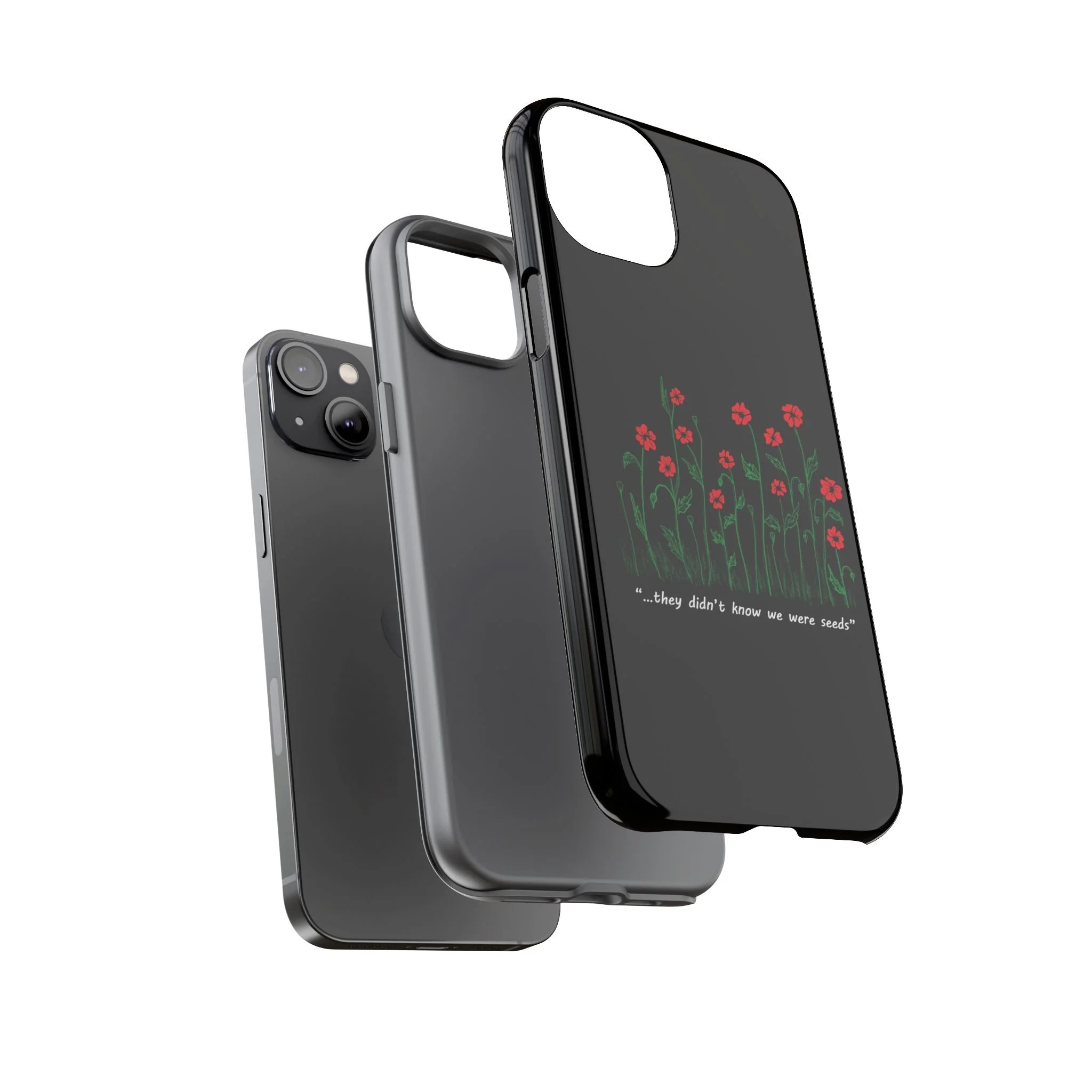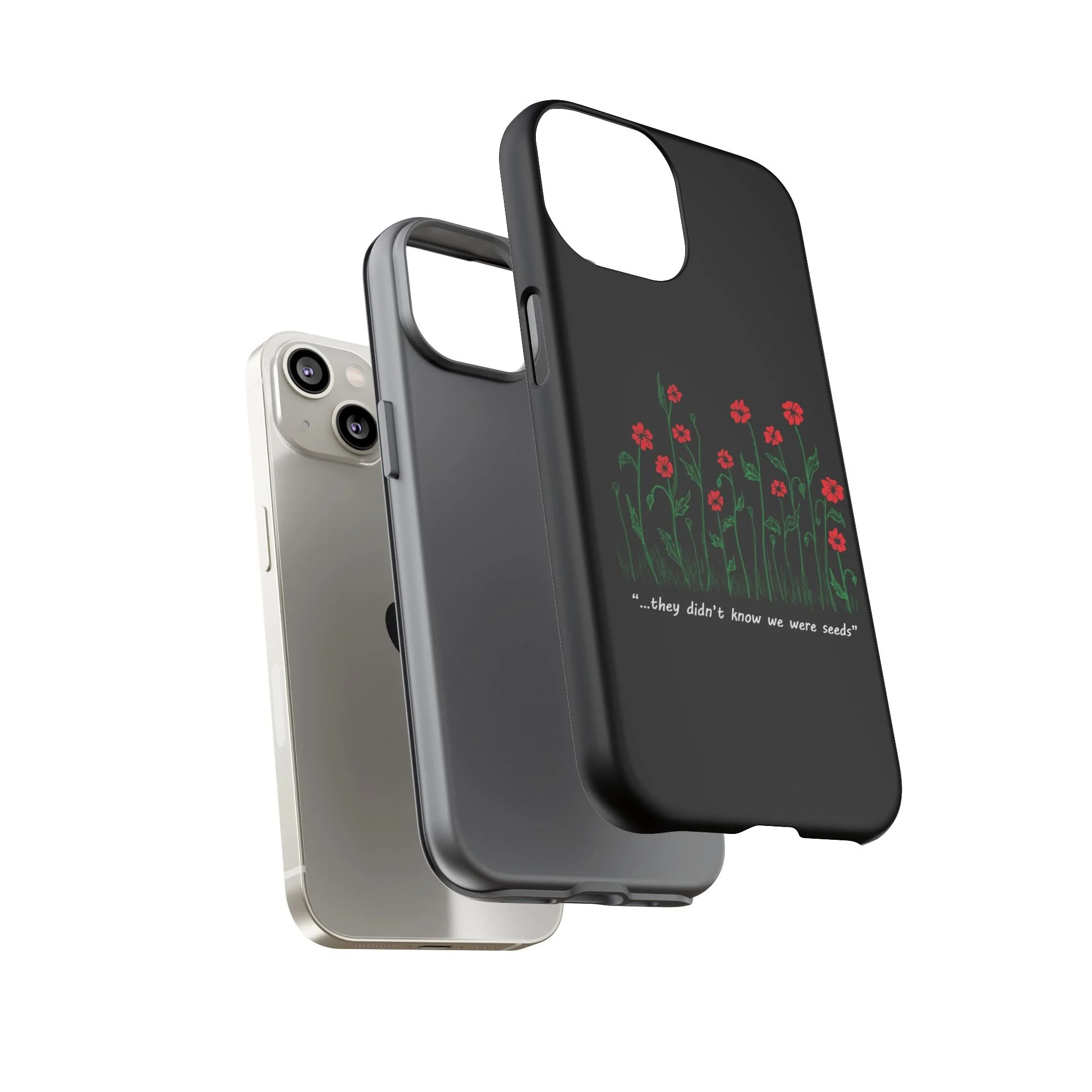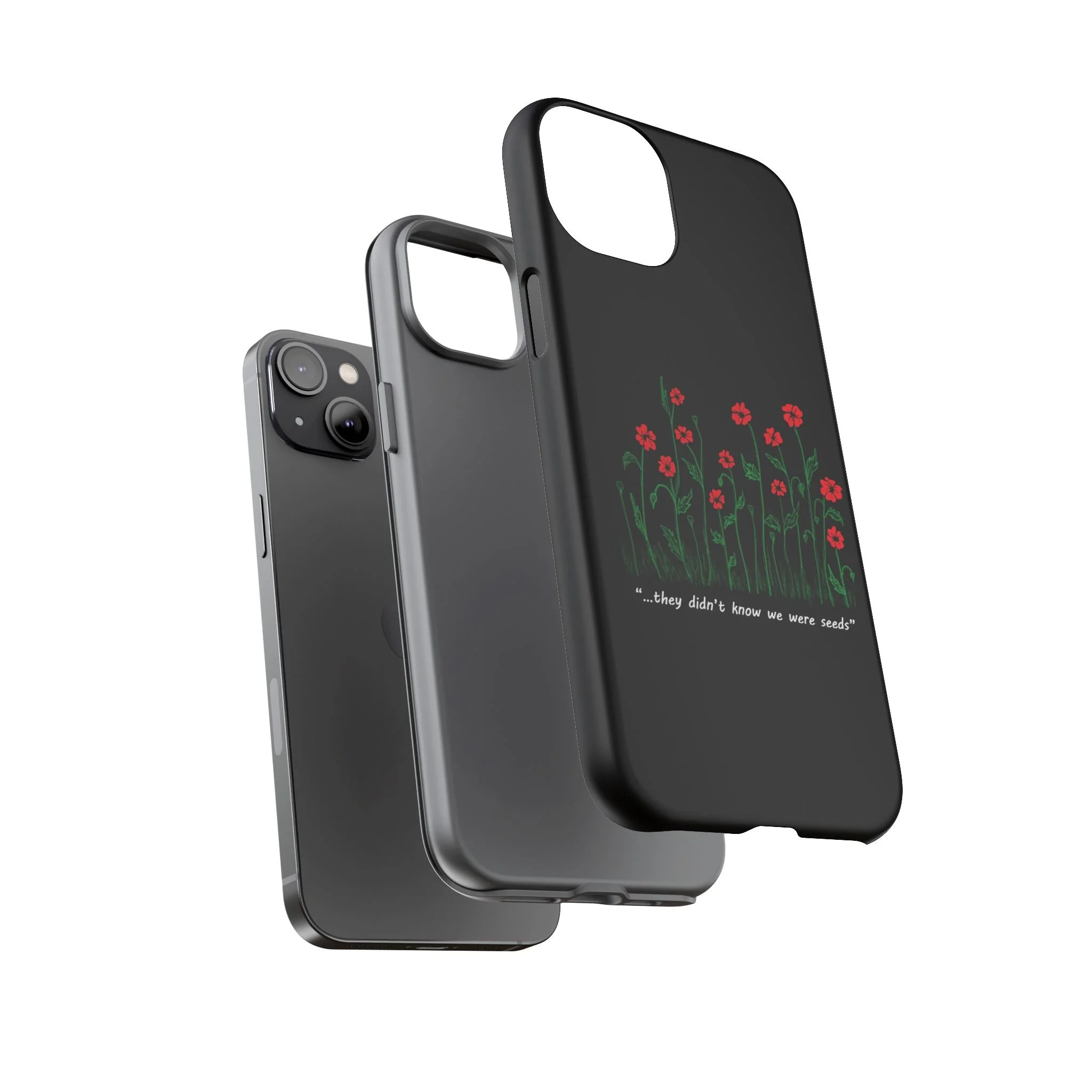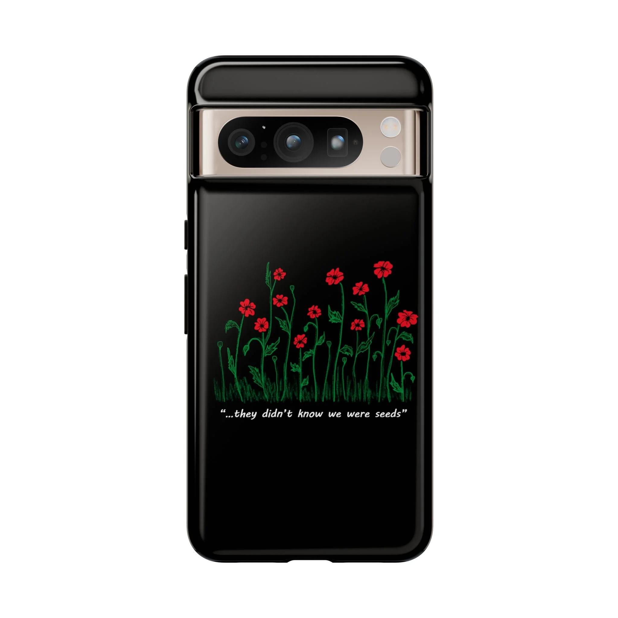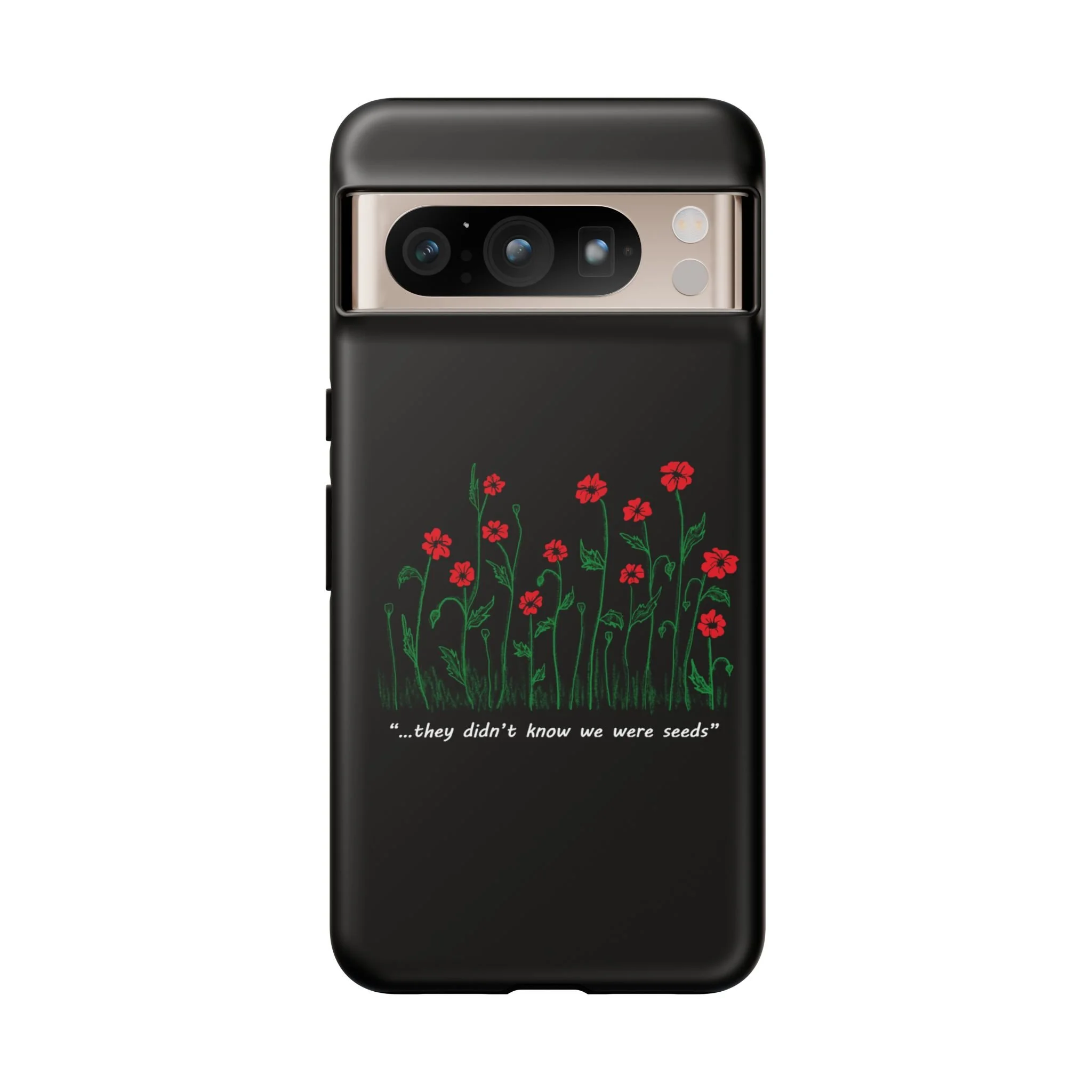 A slim, dual-layer phone case that carries a quiet, defiant charm — delicate red blossoms rising against a deep black backdrop with the small, resonant line: “...they didn’t know we were seeds.” The glossy or matte finish lets the rich 3D-wrapped print stand out while the TPU silicone inner liner cushions daily bumps and drops. This case keeps your device looking artful and guarded: clear cutouts for ports, wireless charging compatibility, and outdoor-resistant UV protection maintain the image and function through everyday use. Thoughtful compliance and durable materials make it a reliable everyday companion for someone who finds strength in subtlety. Speak truth to power with this powerful message. Please reach out if you don't see your phone type and it will get added.