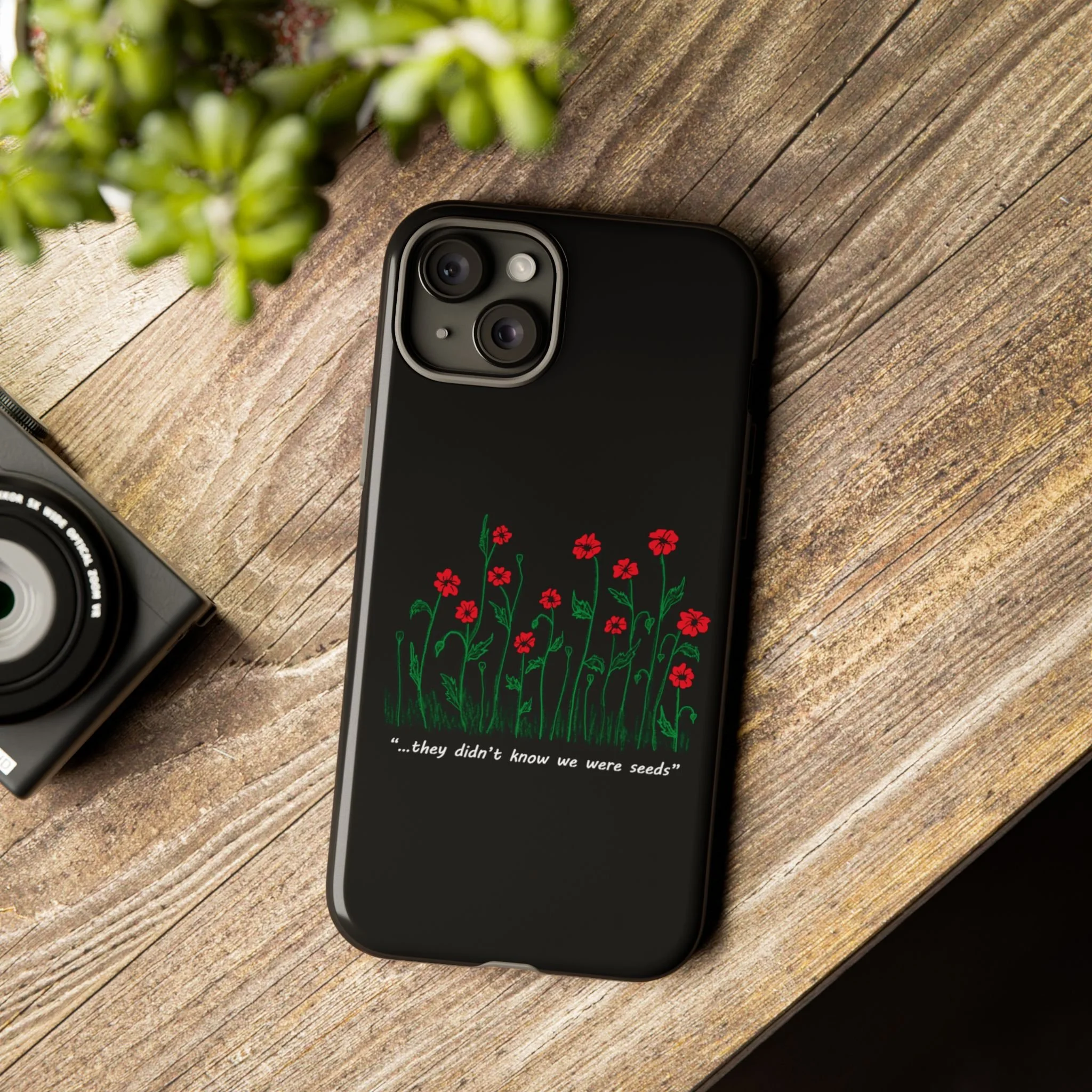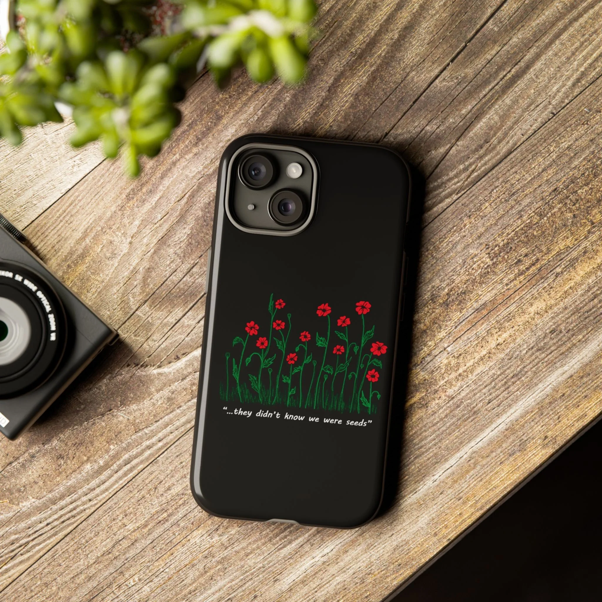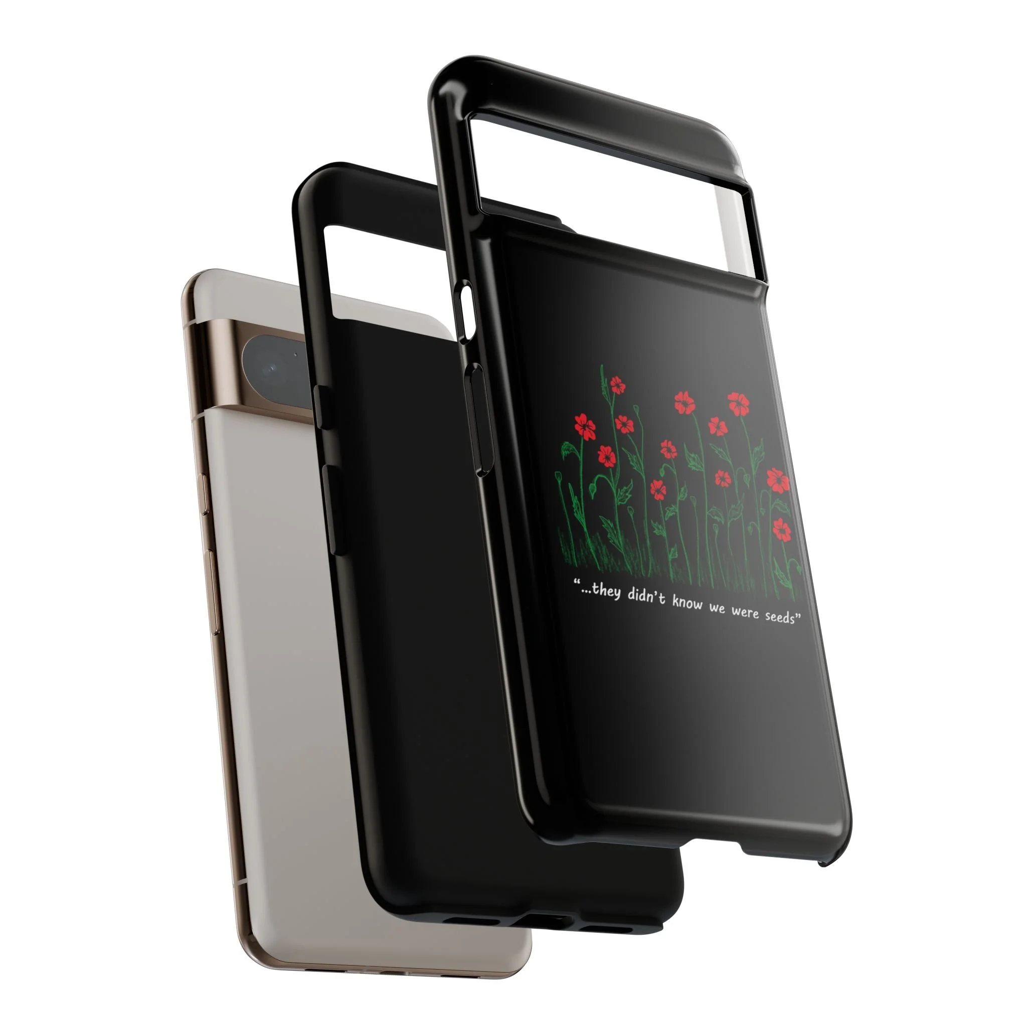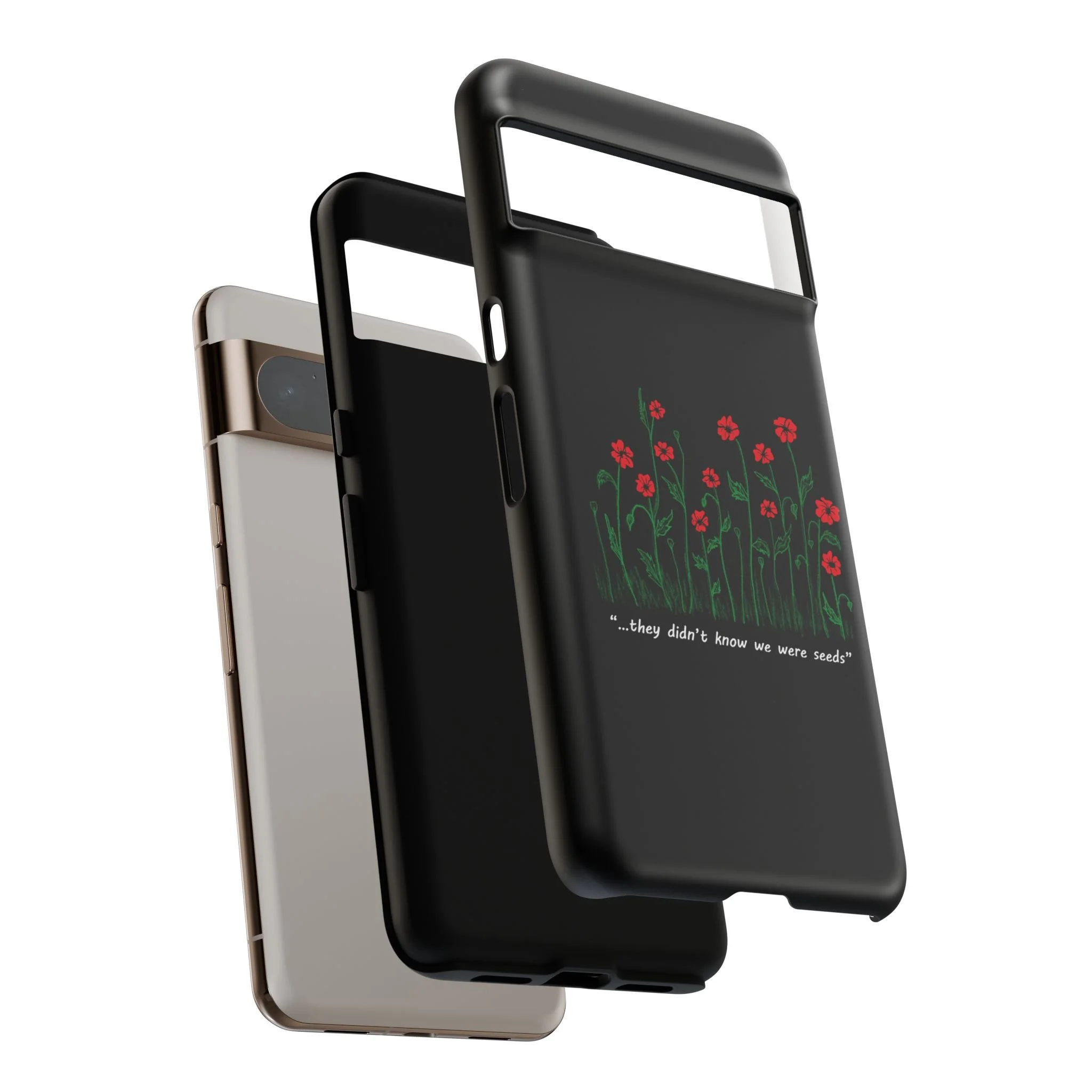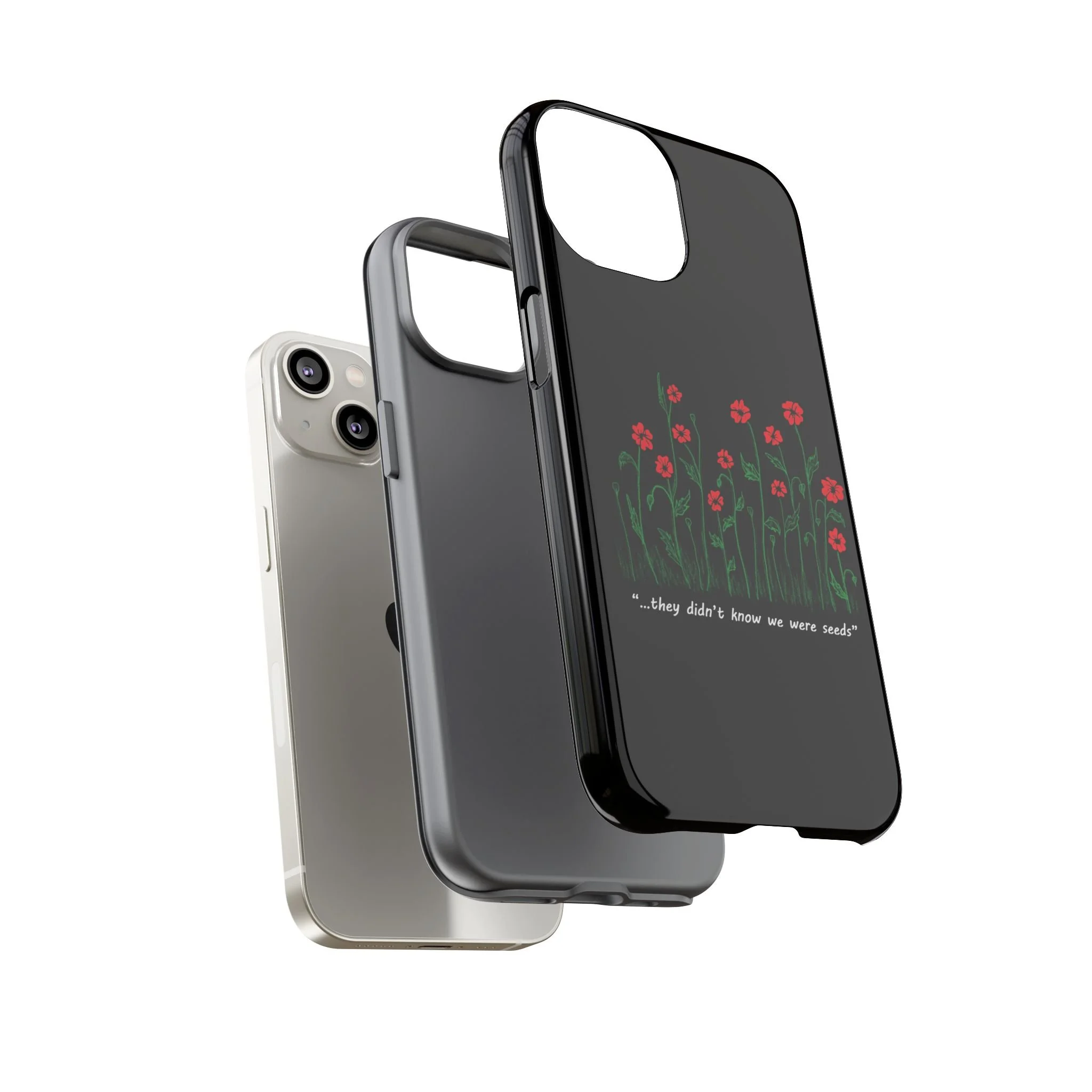 A slim, dual-layer phone case that carries a quiet, defiant charm — delicate red blossoms rising against a deep black backdrop with the small, resonant line: “...they didn’t know we were seeds.” The glossy or matte finish lets the rich 3D-wrapped print stand out while the TPU silicone inner liner cushions daily bumps and drops. This case keeps your device looking artful and guarded: clear cutouts for ports, wireless charging compatibility, and outdoor-resistant UV protection maintain the image and function through everyday use. Thoughtful compliance and durable materials make it a reliable everyday companion for someone who finds strength in subtlety. Speak truth to power with this powerful message. Please reach out if you don't see your phone type and it will get added.