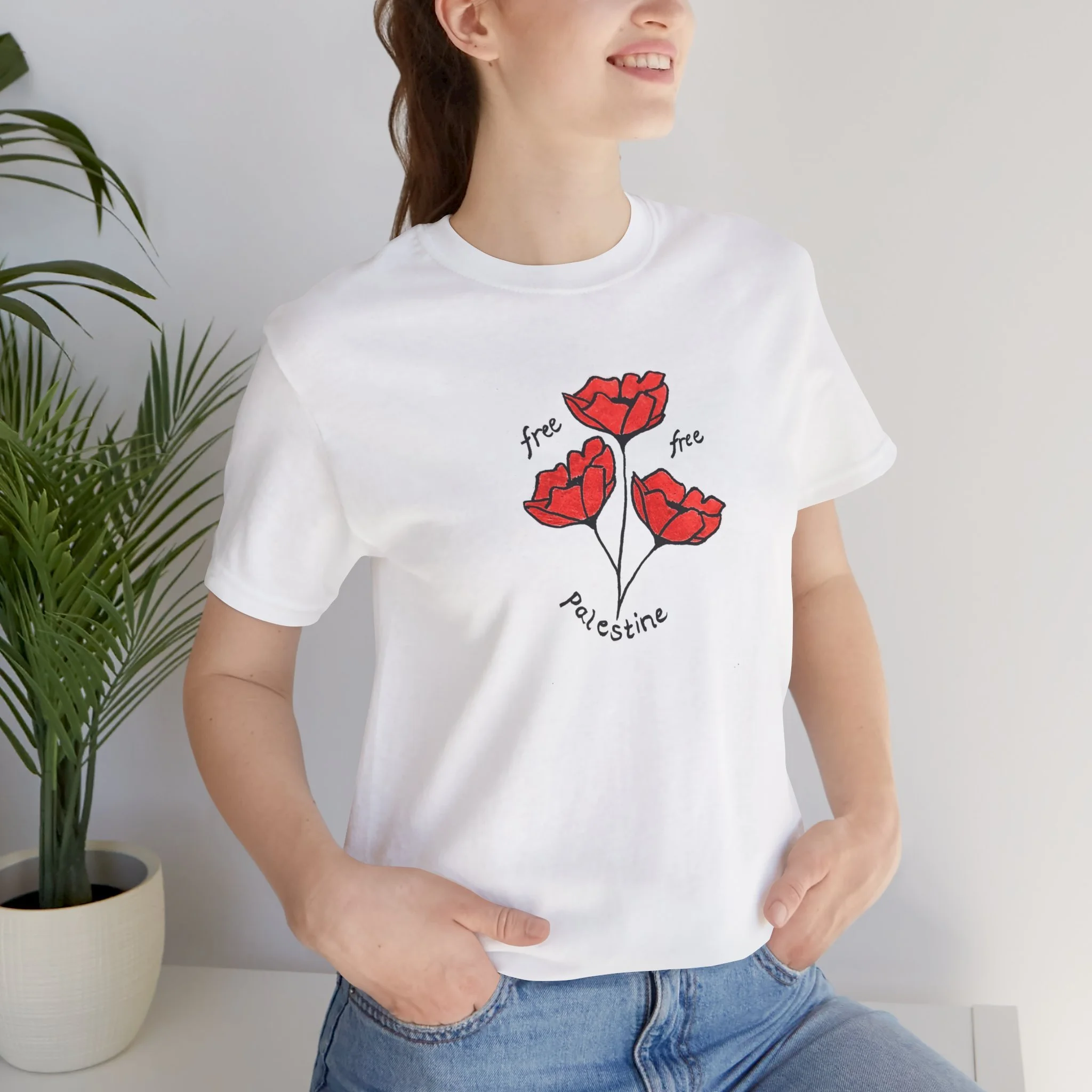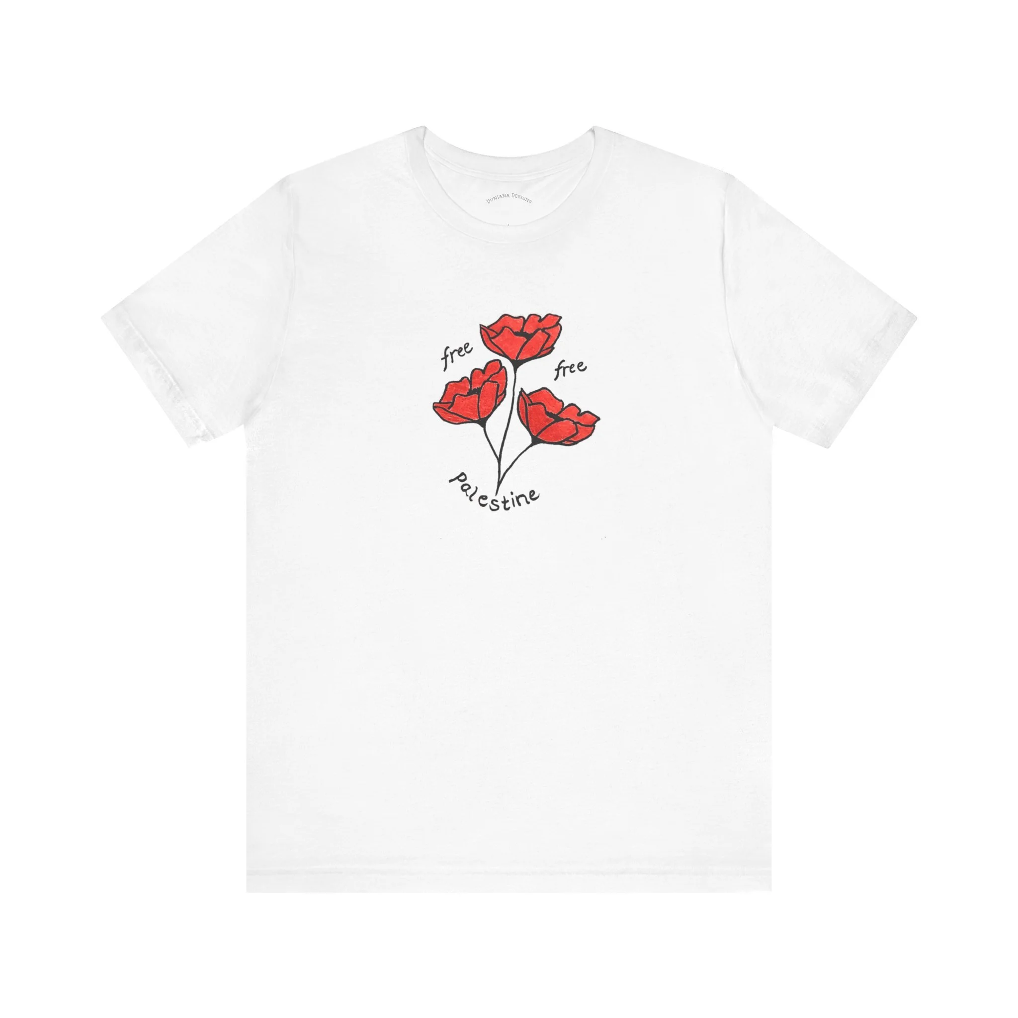 A white T-shirt featuring 3 red poppies and the words 'free free Palestine'. This shirt gives off a strong message of support and activism, perfect for those passionate about justice for Palestine. Ideal for wearing to protests, rallies, or everyday wear to spread awareness.