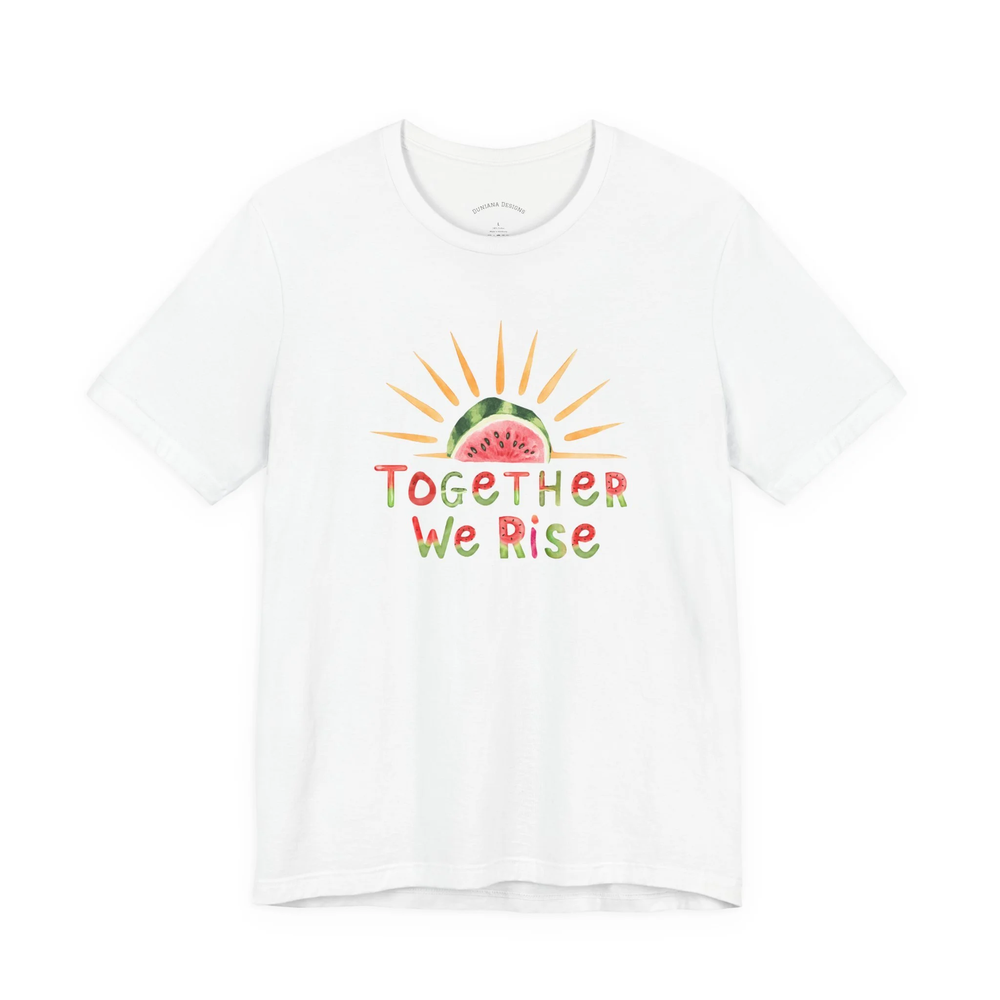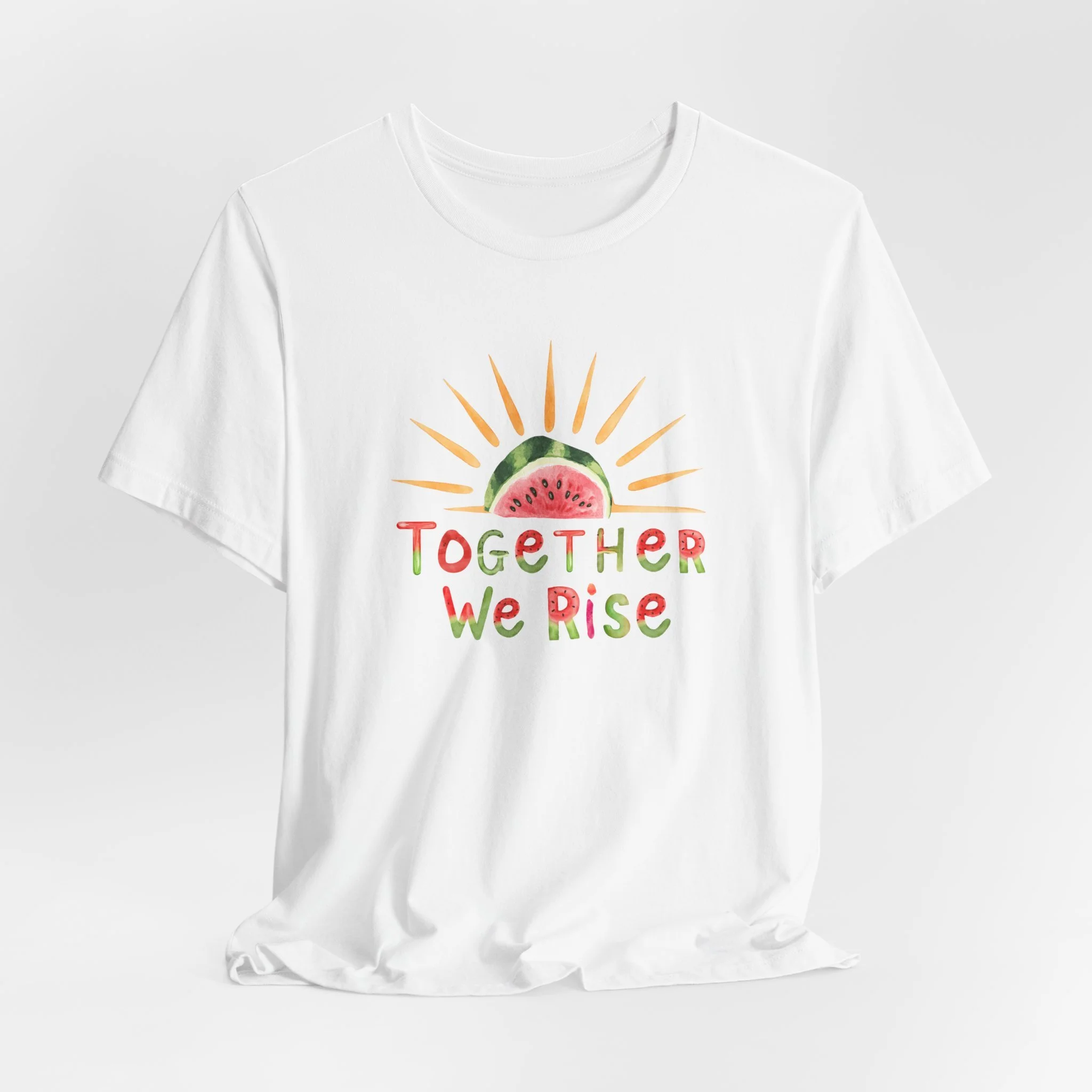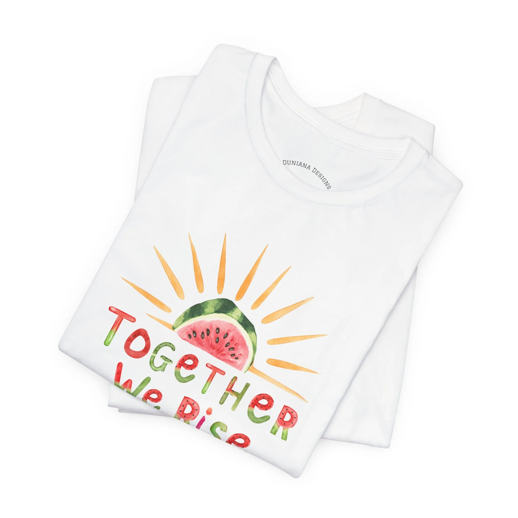 Sun-washed and unified, this lightweight tee carries a small, hopeful manifesto: Together We Rise. The watercolor-style watermelon and rising-sun illustration feels hand-painted, warm and slightly whimsical—like a backyard morning with friends and the promise of freedom for Palestinians everywhere. Breathable Airlume combed and ring-spun cotton keeps the shirt soft against skin while the side seams and shoulder tape hold shape through repeat wears. Wear it to community gatherings, summer protests, farmer’s markets, or slow coffee mornings to signal quiet solidarity and shared optimism.